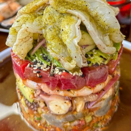 Deliciosa torre de mariscos, camarón crudo, camarón cocido, ceviche de pescado, atún pulpo