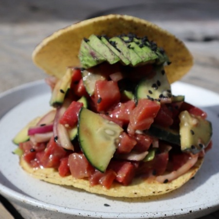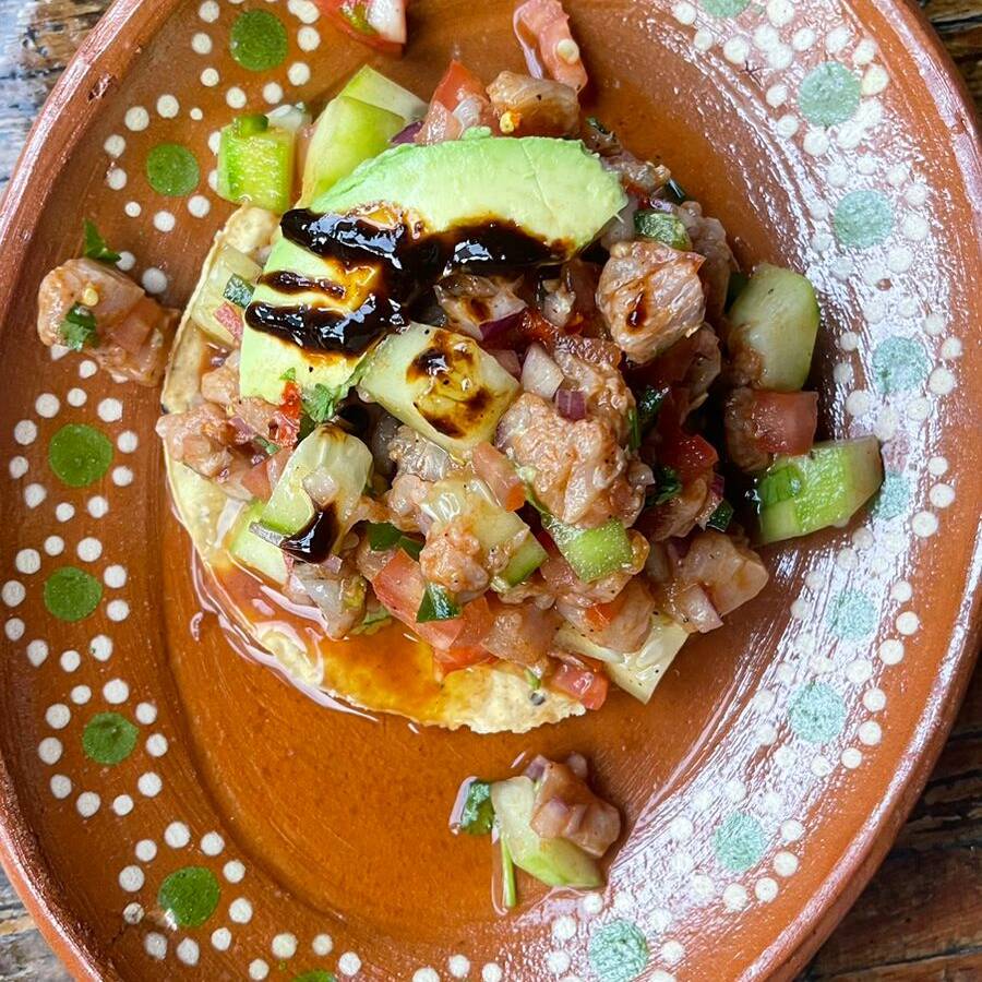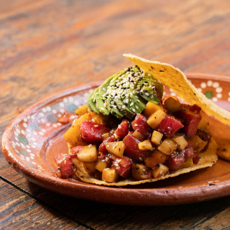 Tostada de atún fresco con pepino, cebolla y cubitos de aguacate, todo bañado en nuestra cremosa salsa oriental —una especialidad de la casa— con un toque de aceite de ajonjolí que realza su sabor con un perfil único y delicioso.