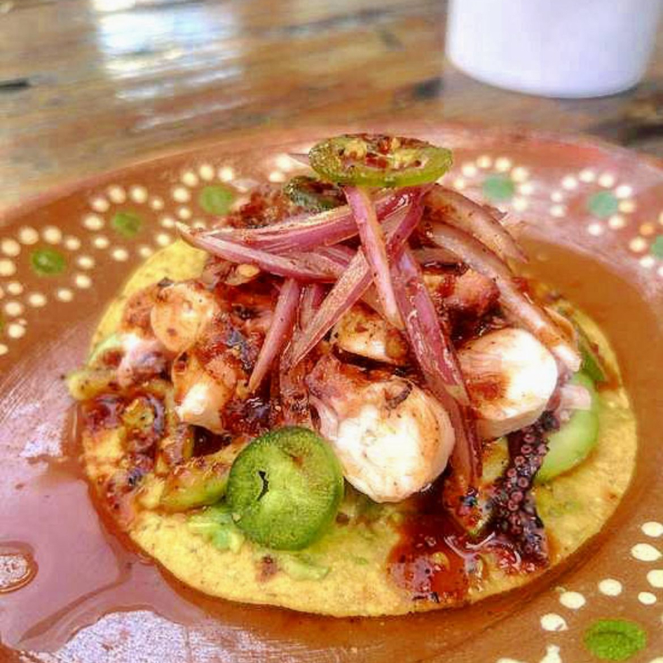 Pulpo suave y picoso salteado en salsa enchilada, servido sobre una tortilla dorada y queso gratinado. (Guacamole, repollo, pico de gallo, crema y chipotle )