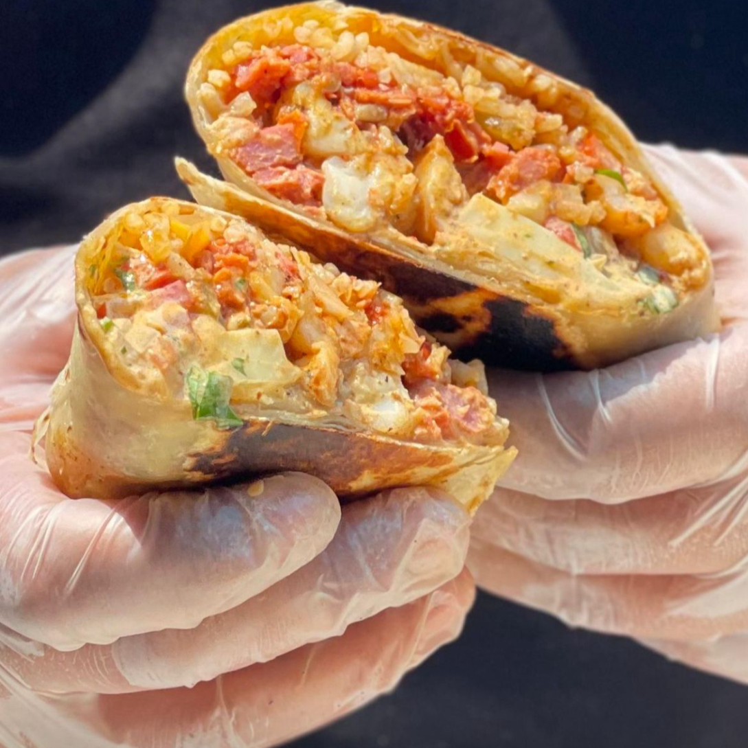 Tortilla de harina grande rellena de marlín ahumado y camarón enchilado, con arroz, queso gratinado, chipotle cremoso y pico de gallo.