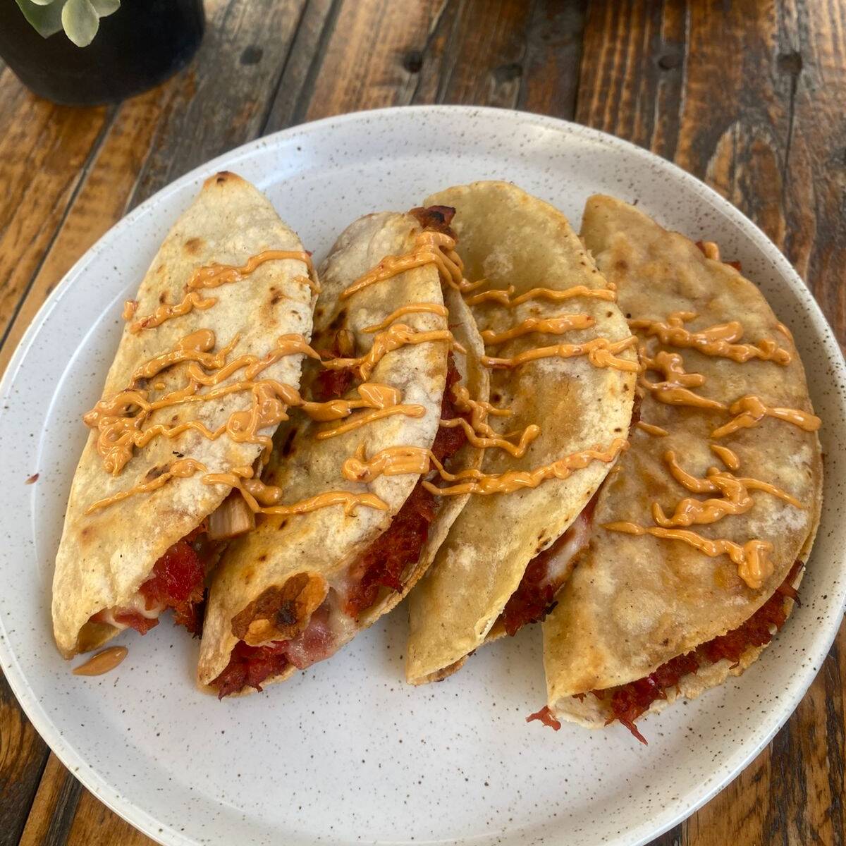 Deliciosa combinación de marlín ahumado, camarón enchilado y pulpo a la plancha y servidos sobre una tortilla con queso gratinado. (Repollo, pico de gallo, crema y chipotle)