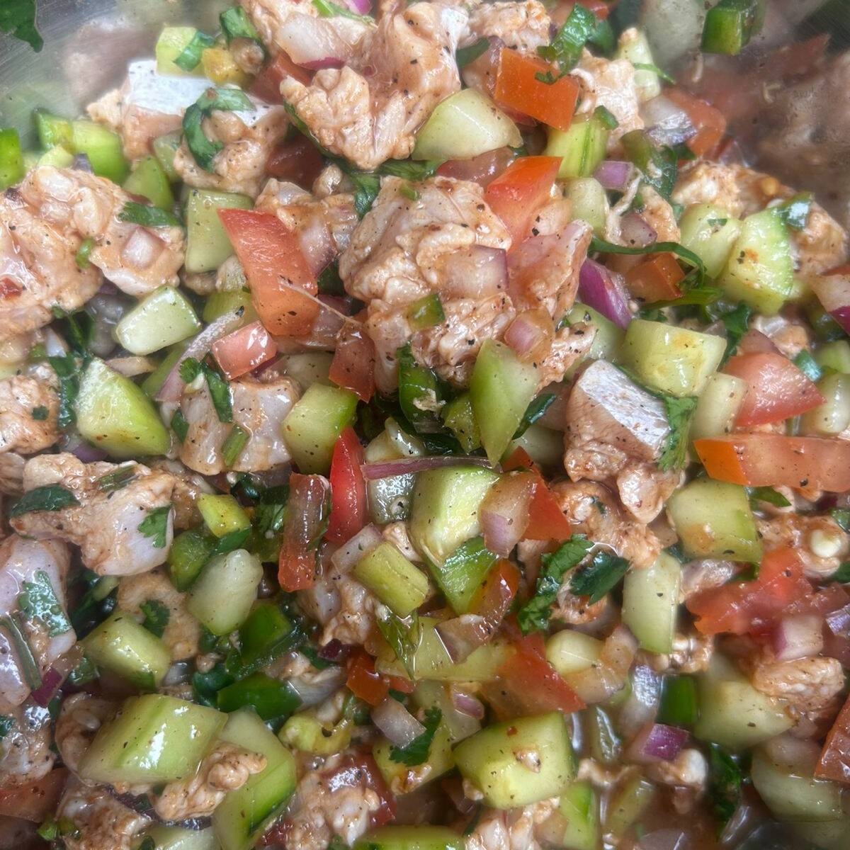 Pescado curtido en limón y salsa de la casa acompañado de pepino, tomate, cebolla morada y cilantro, decorado con aguacate