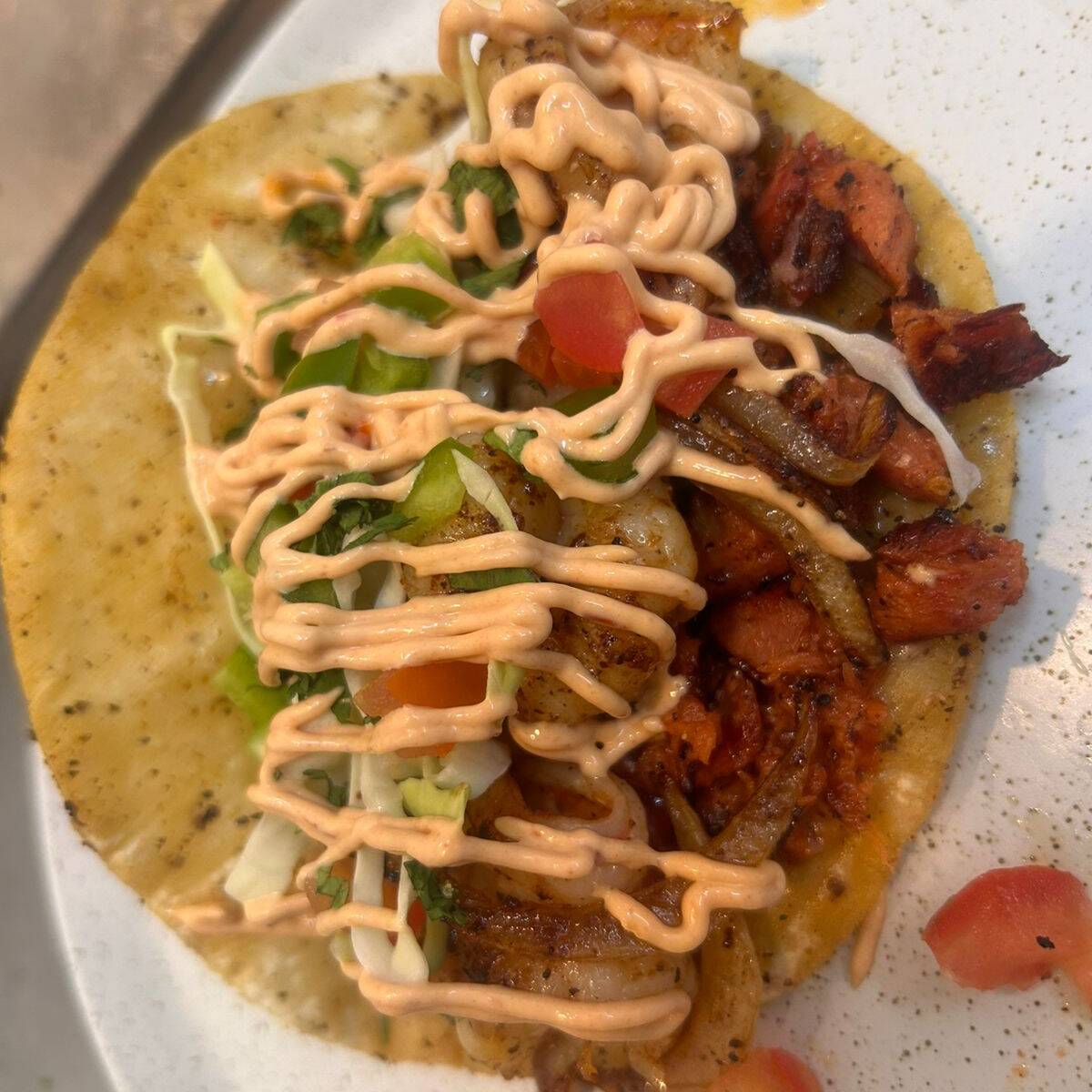 Camarón jugoso, capeado y frito, un taco crujiente y lleno de sabor.(Repollo, pico de gallo, crema y chipotle)