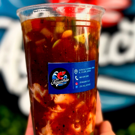 Una explosión de sabor con pulpo, almeja chocolata, camarón crudo y cocido, todo bañado en nuestra salsa casera chiltepín, Vaso 16oz.