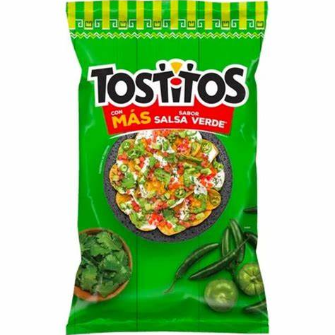 Tostitos verdes con aguachile, camaron curtido, pepino, cebolla morada y salsa de la casa