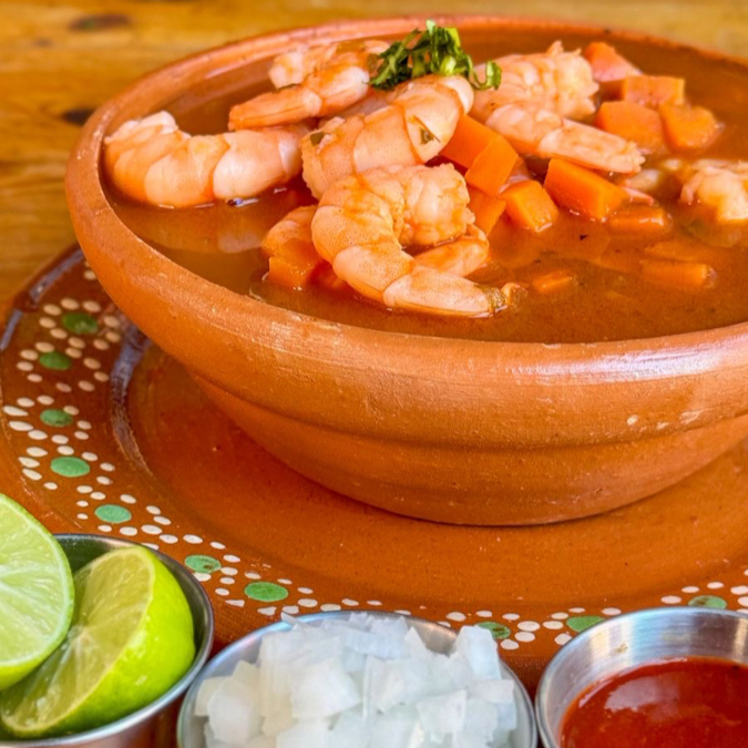 Preparado con camarones frescos , zanahoria y apio en un caldo ligeramente picoso, servido caliente en vaso de 24oz y acompañado de tortillas