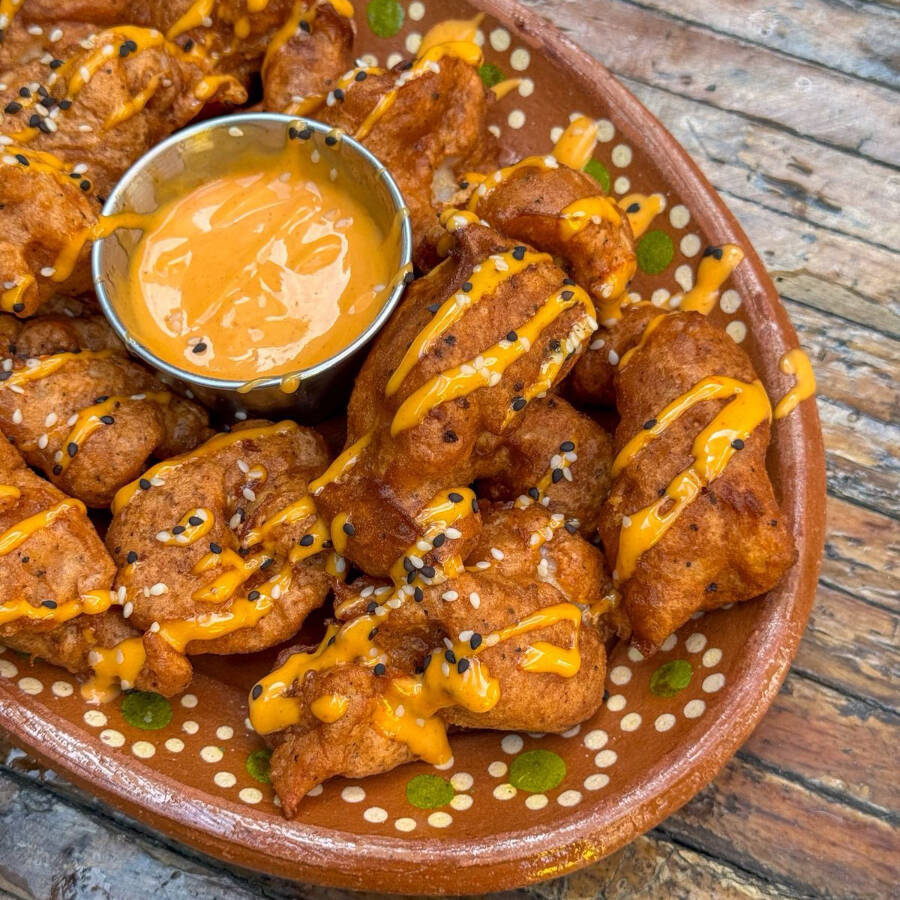 15 Crujientes camarones empanizados, bañados en una cremosa salsa estilo chipotle con un toque dulce y picosito.