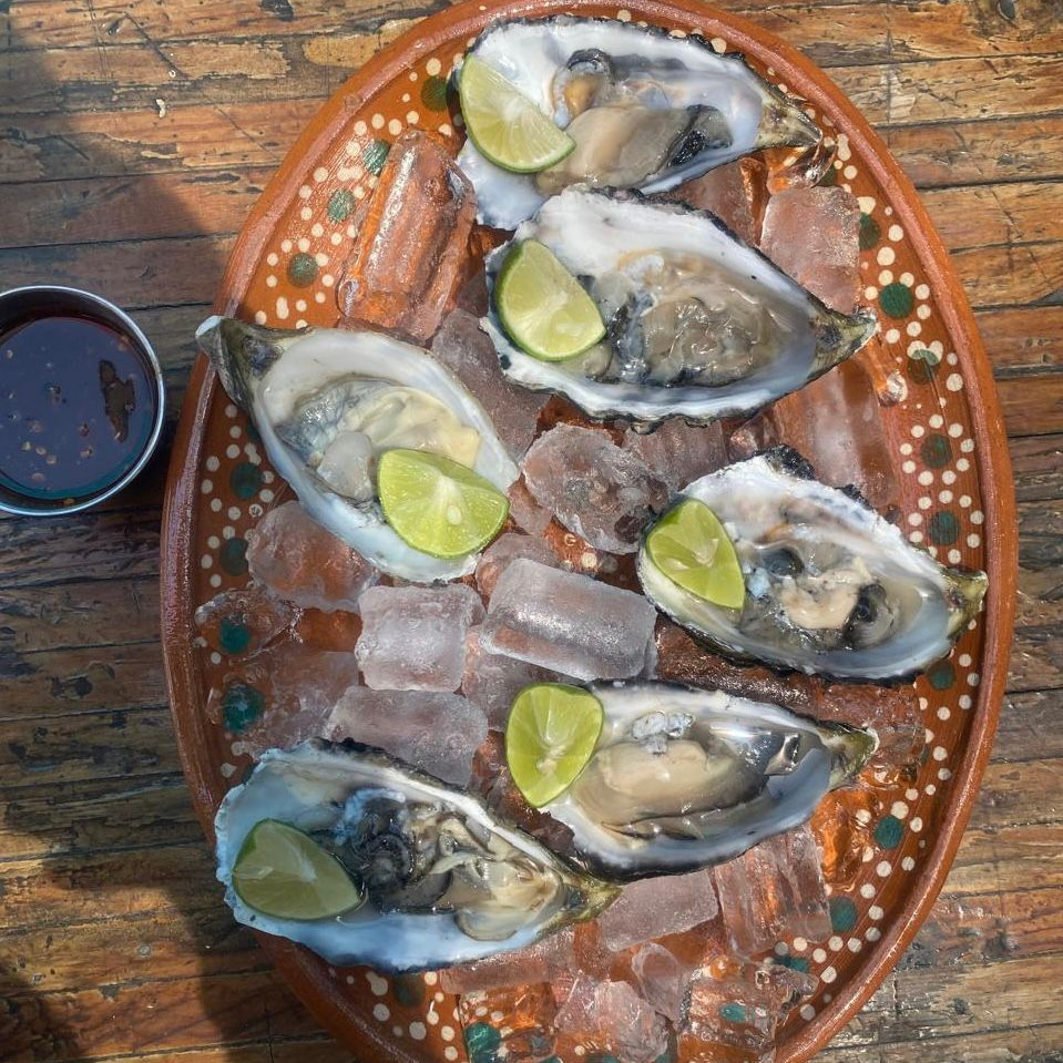 Seis ostiones frescos recién abiertos, servidos en su concha con limón y salsas de la casa.