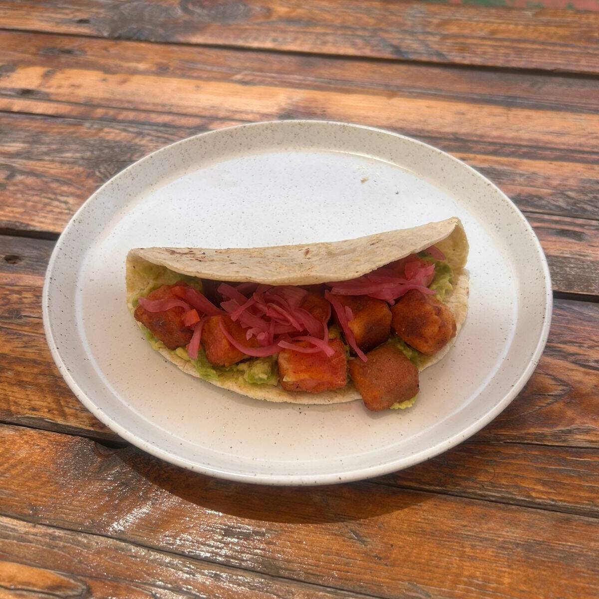 Atún crujiente, bien sazonado, en su versión chicharrón para un taco con un toque único.(Guacamole y cebolla morada curtida en limón).