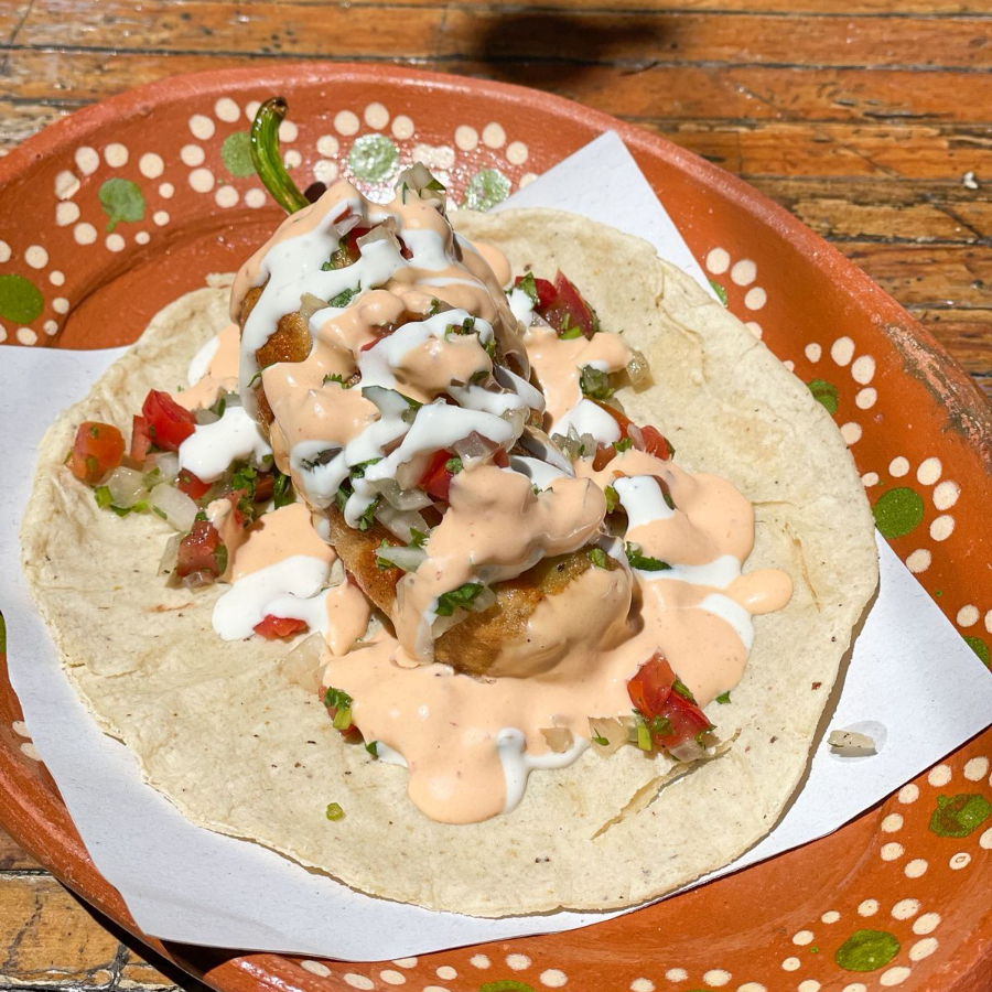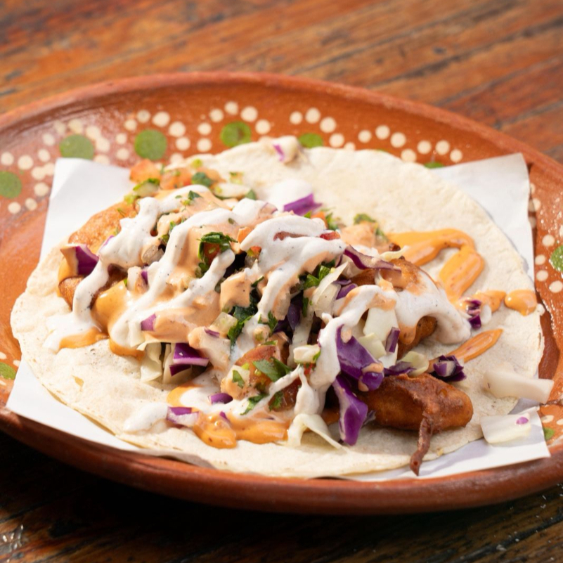 Pescado fresco, perfectamente capeado y frito , servido en una tortilla suave. (Repollo, pico de gallo, crema y chipotle)
