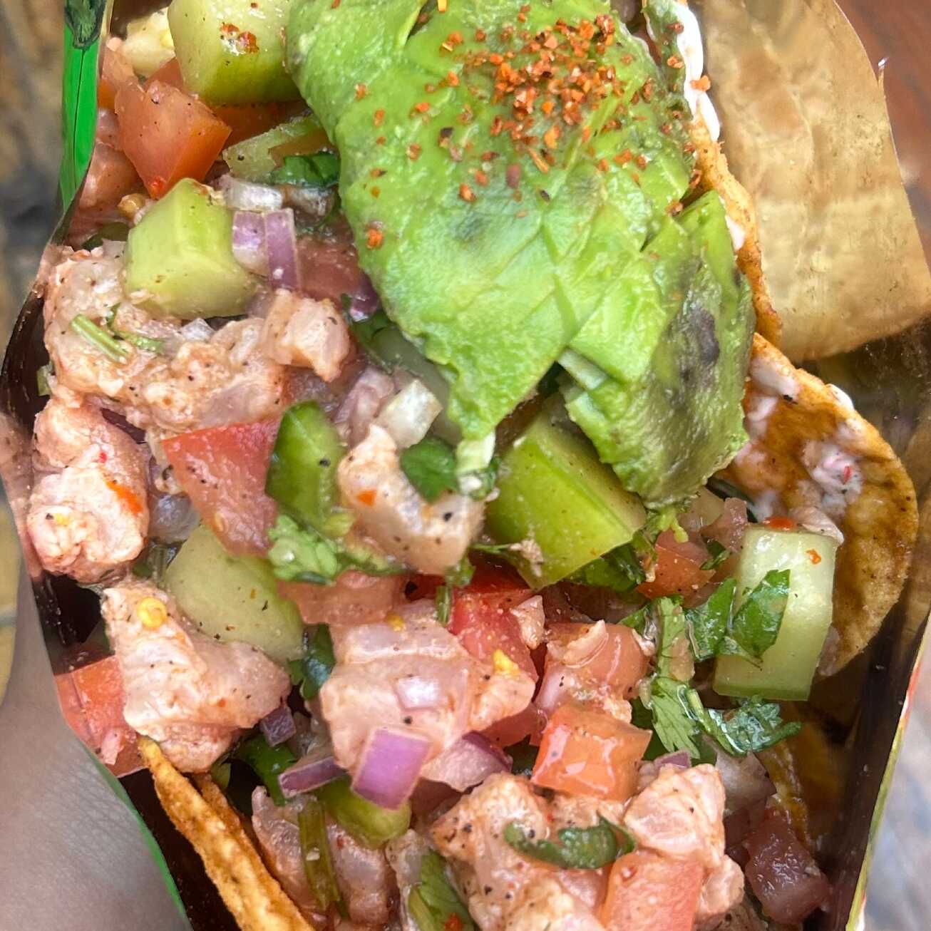 Tostitos verdes con ceviche de pescado curtido en limón , pepino, chile , tomate y cebolla morada