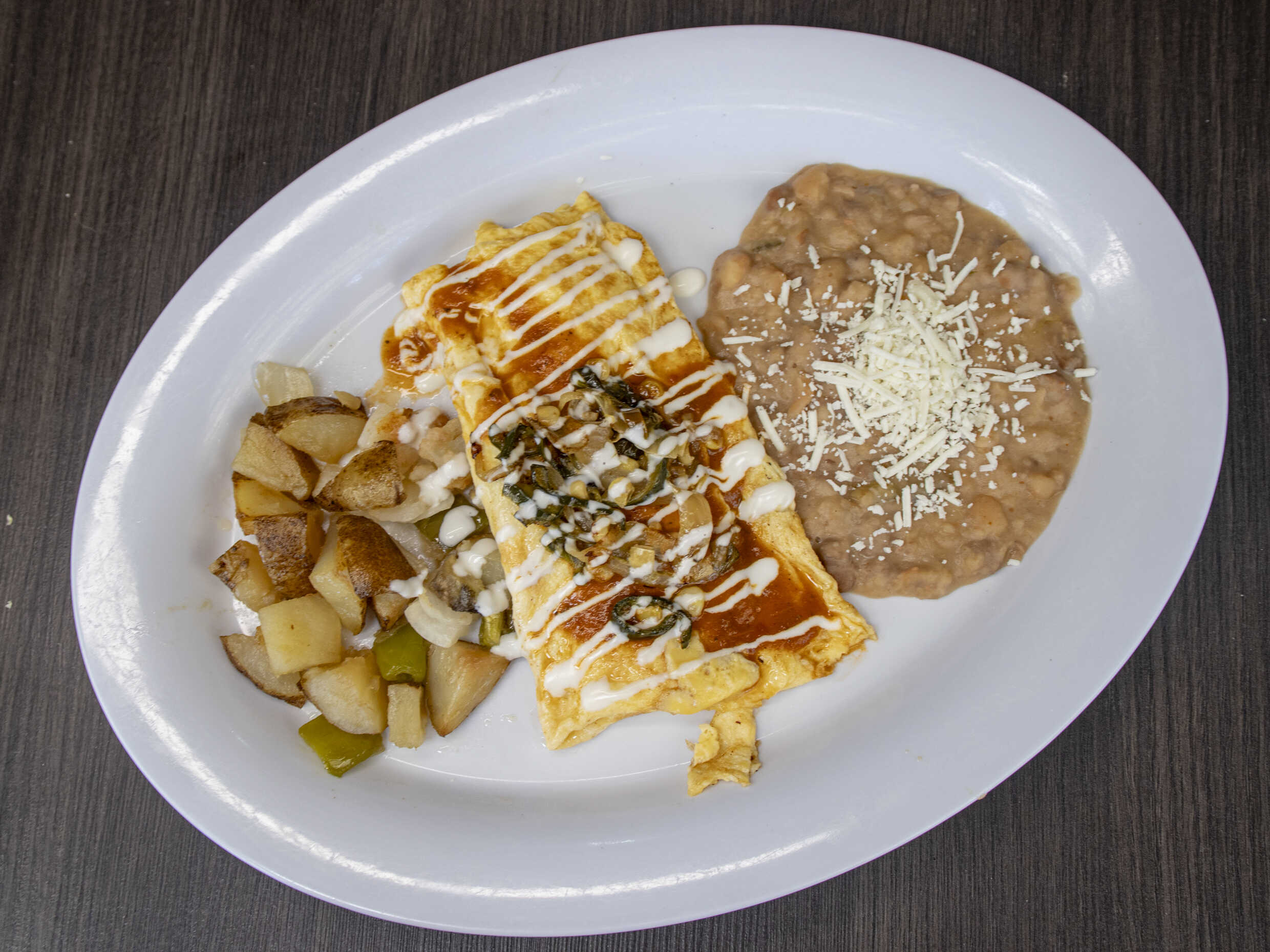Elige tu preferido. Acompañado de papas lionesas y frijoles.