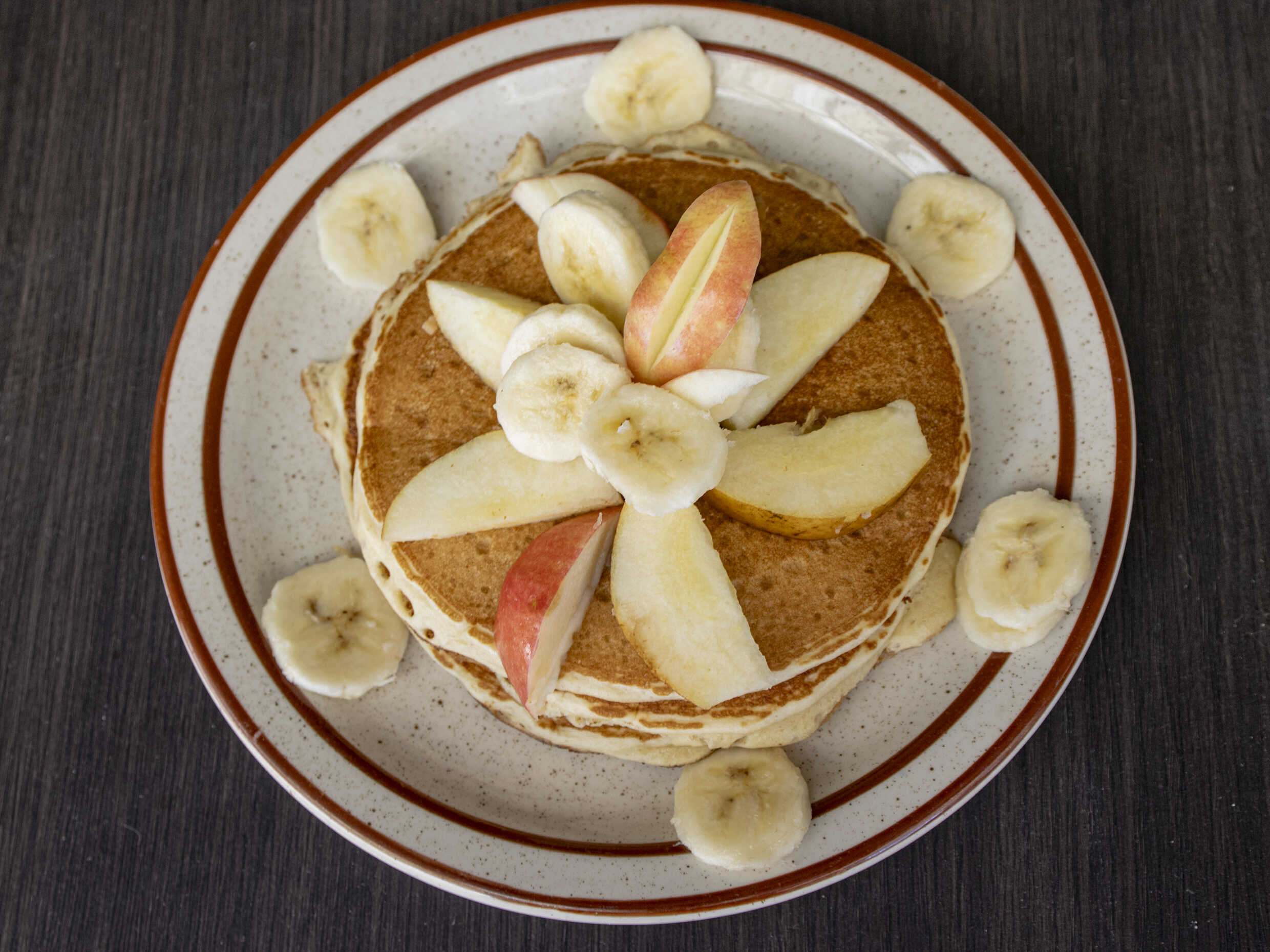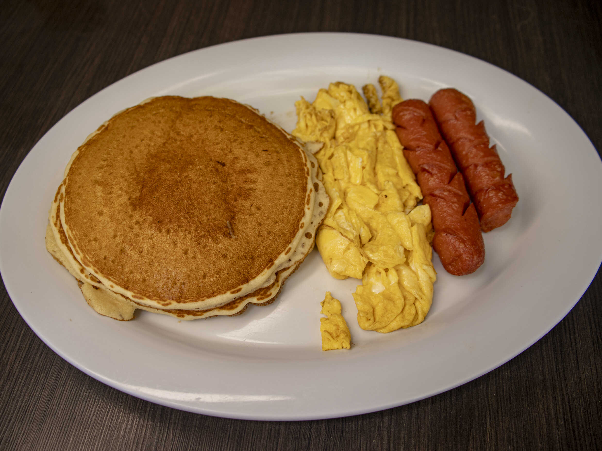 Tres piezas hot cakes, dos piezas huevo, y salchicha asada
