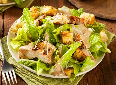 Porción personal: Lechuga orejona, espinacas, pepino, tomate, pimiento morrón, cebolla morada, crotones.