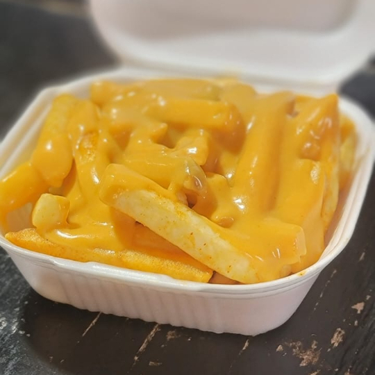 Papas fritas cubiertas con queso derretido.