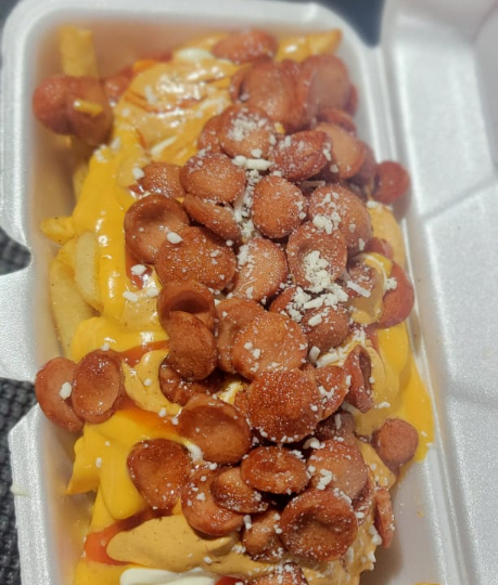 Papas fritas con salchicha estilo callejero.