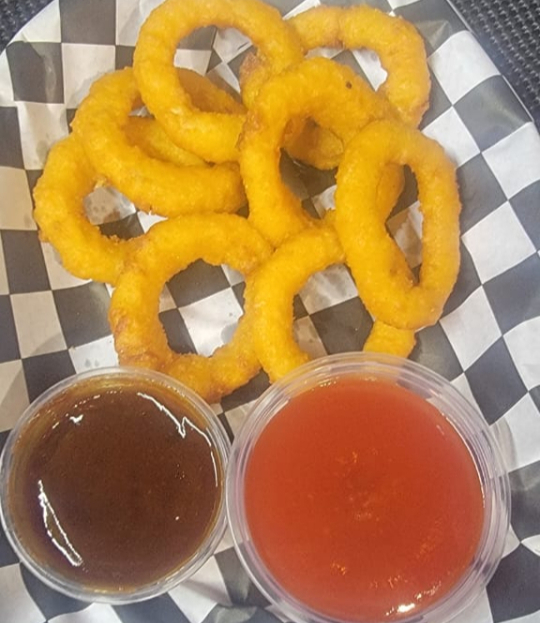 Aros de cebolla empanizados y dorados.
