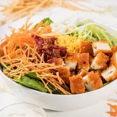 Pollo, lechuga mixta, zanahoria, col morada, frituras, queso cheddar y aderezo Ranch.