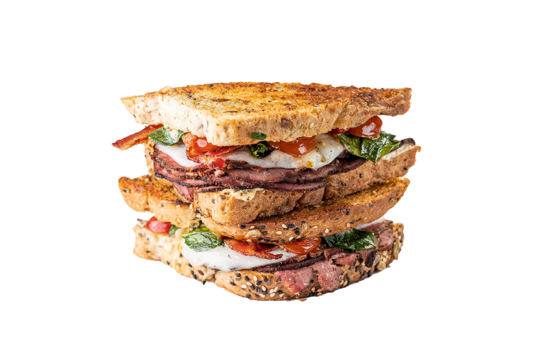 Sandwich en pan multigrano, roast beef con espinaca baby y tomate con vinagreta, tocino, queso provolone y aderezo mayostaza artesanal
