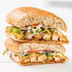 Pan de chia, cubierto con ajonjolí negro, avena y semilla de girasol,pollo crispy con salsa buffalo, queso pepper jack, salsa de queso, lechuga italiana, steak de tomate y aderezo ranch