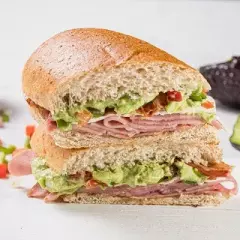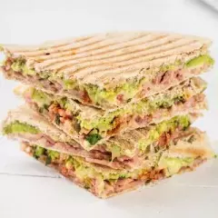 Jamón de pavo y queso panela a la plancha con pico de gallo, tocino , guacamole y mayostaza