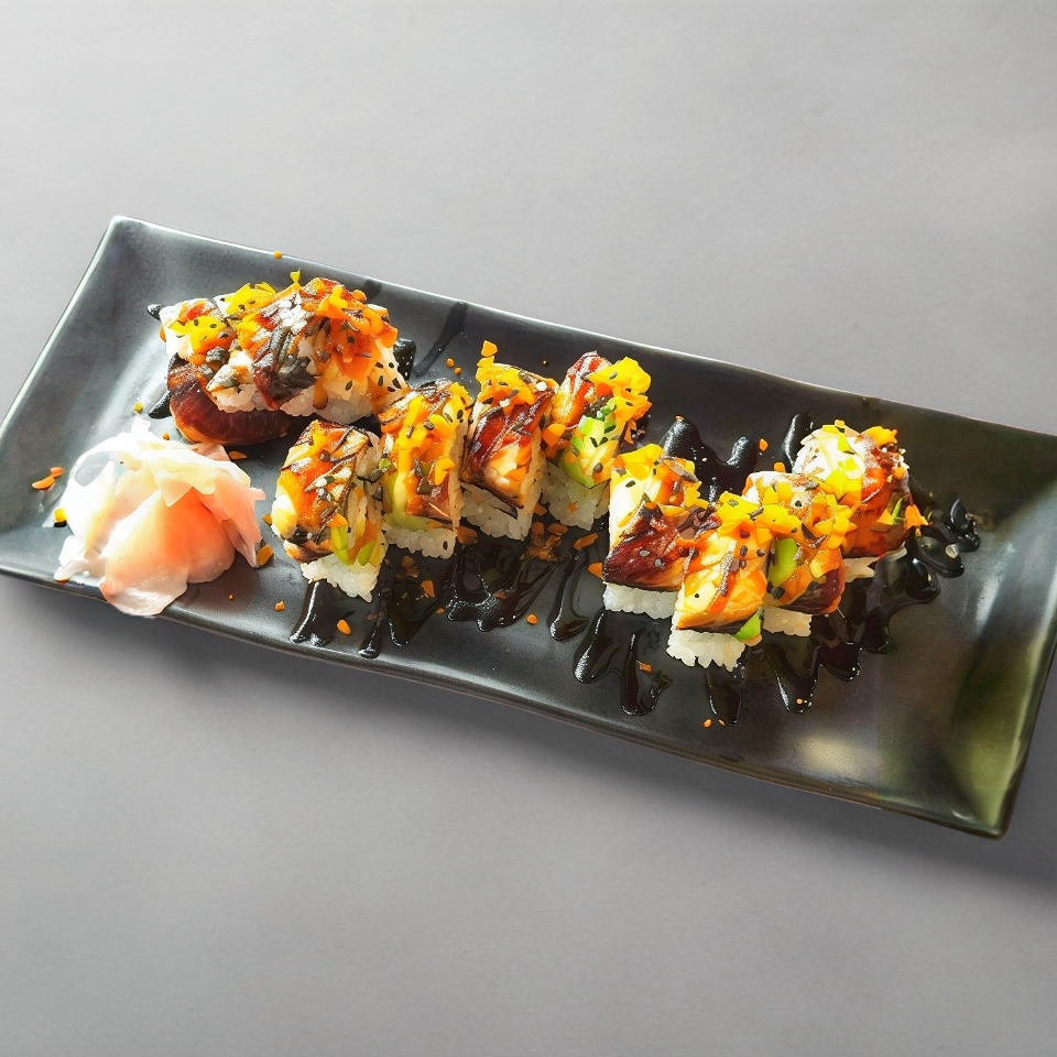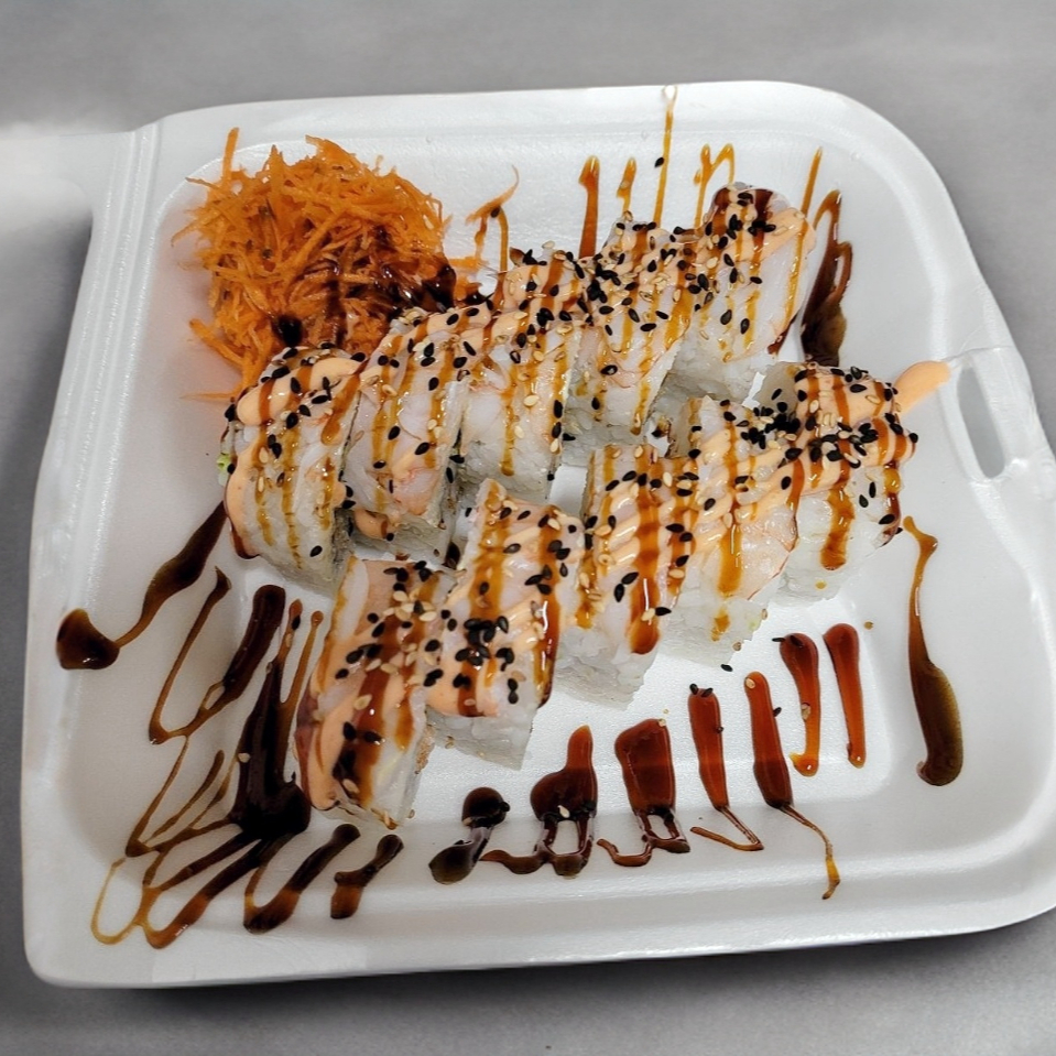 Camaron empanizada,queso phila y aguacate.por fuera forrado camaron can salsa chipotle y salsa anguila.