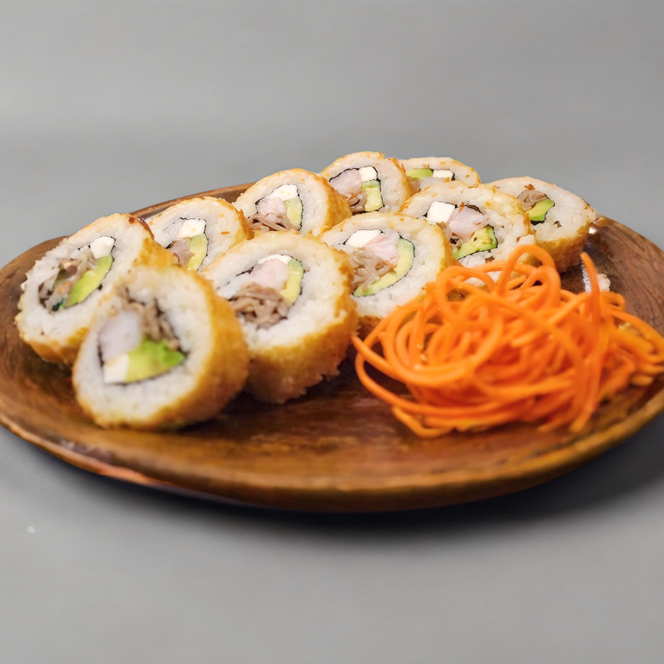 Camarón empanizado, aguacate, queso philadelphia y pepino por fuera empanizado