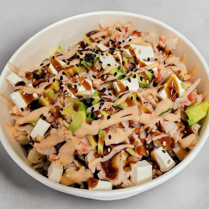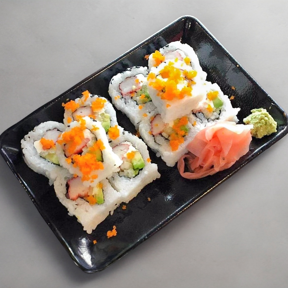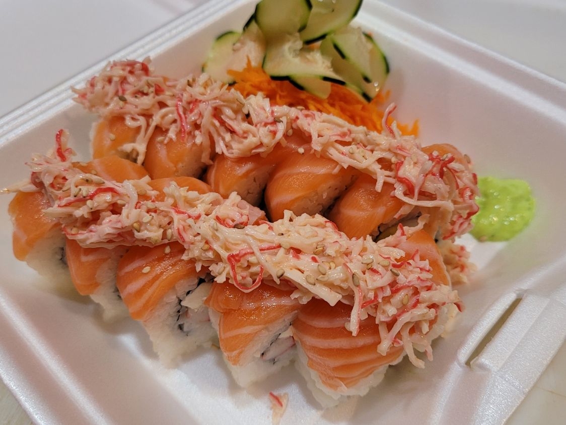 Surimi, aguacate, queso philadelphia por fuera forrado de salmón fresco y surimi.