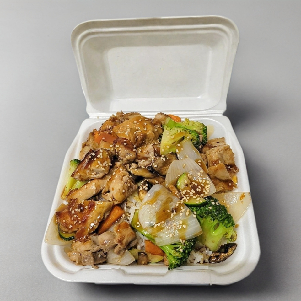 Cama de arroz blanco con pollo teriyaki y verduras.
