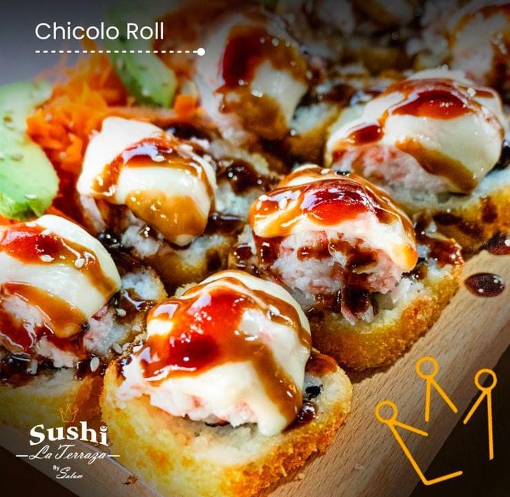 Por dentro: Philadelphia, res, pollo,tocino y surimi empanizado y por encima queso chihuahua tocino, serrano, camarón finamente picado con aderezo chipotle bañado en salsa anguila