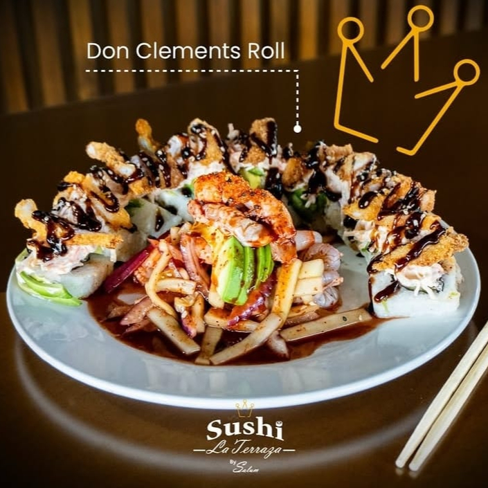 Por dentro: Philadelphia, aguacate,pepino y camarón y por fuera forrado con laminas de mango bañado en salsa Don Clement