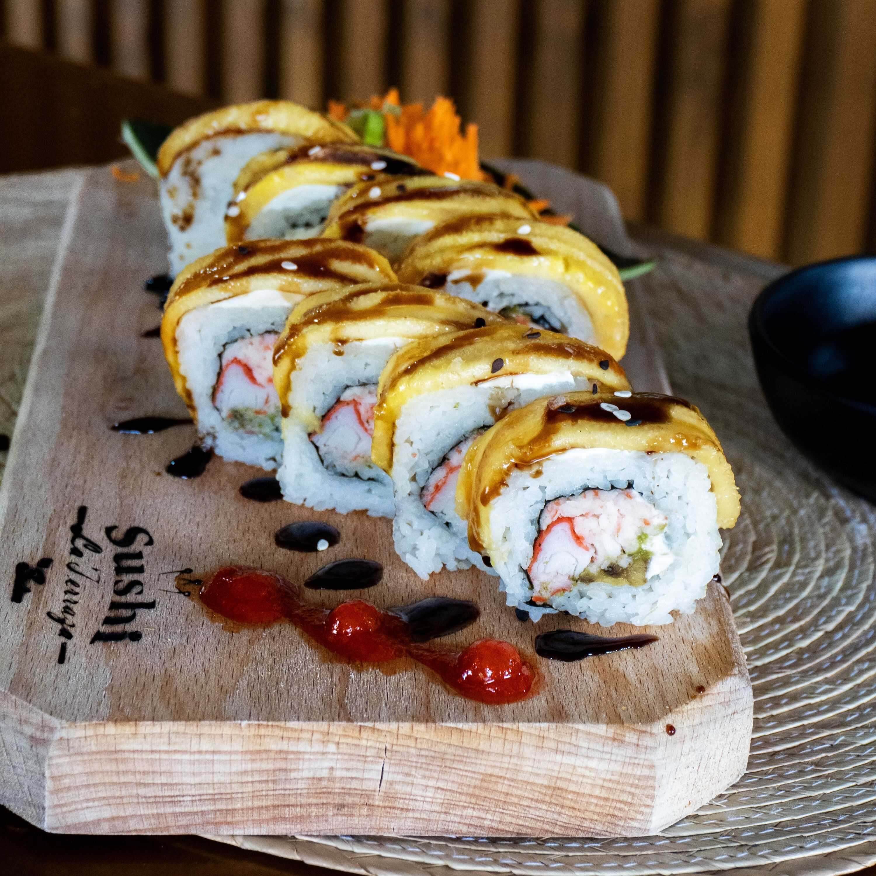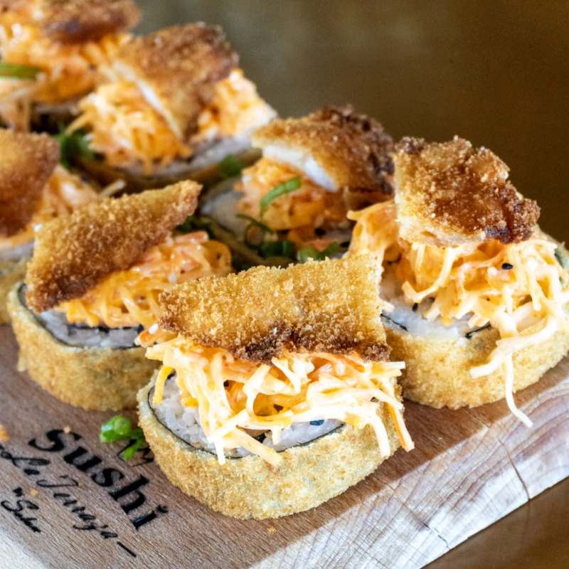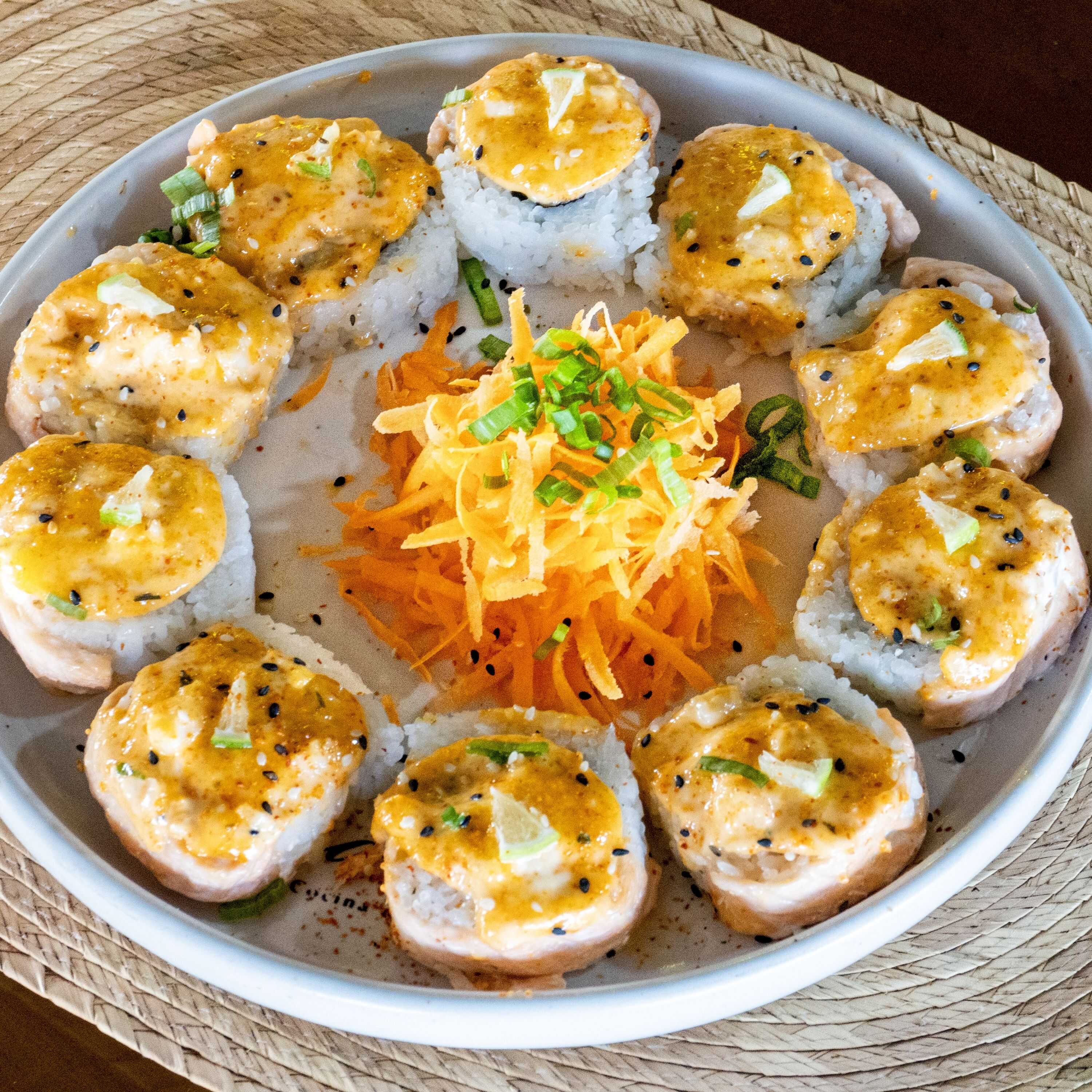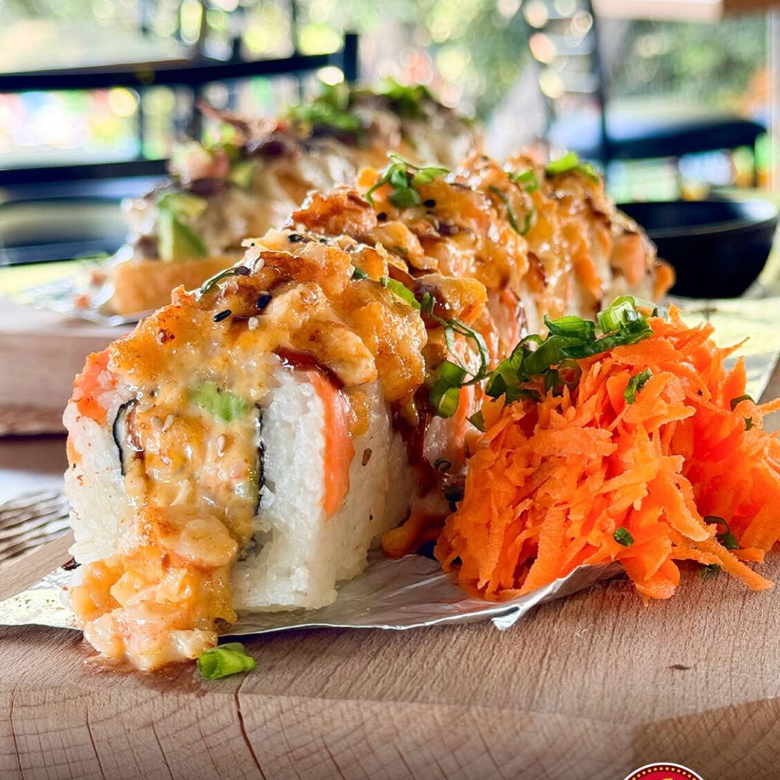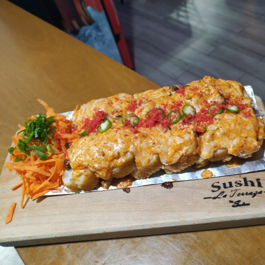Por dentro: philadelphia, aguacate, pepino y camarón. Por encima: gratinado, kanikama spicy con trozos de camarón empanizados bañado en salsa de anguila y ajonjolí.