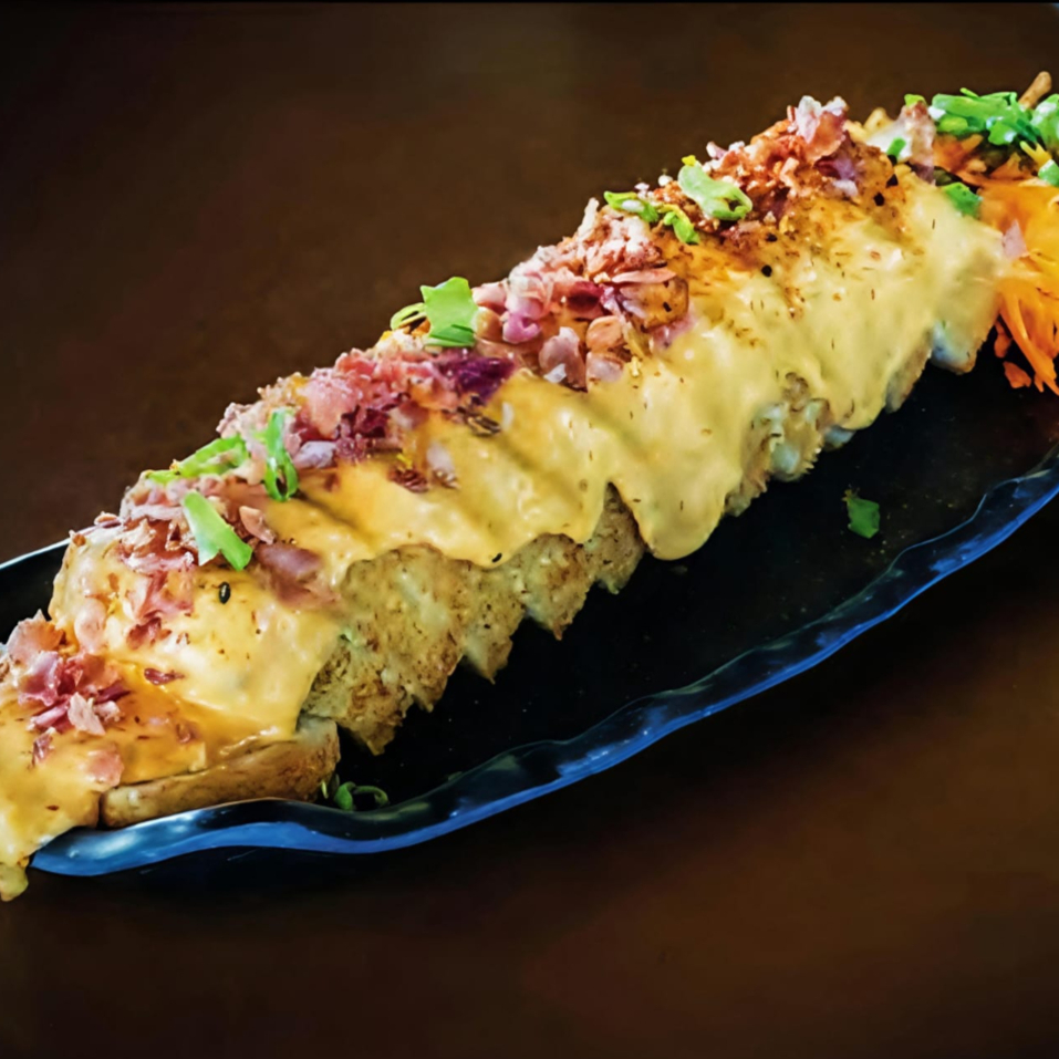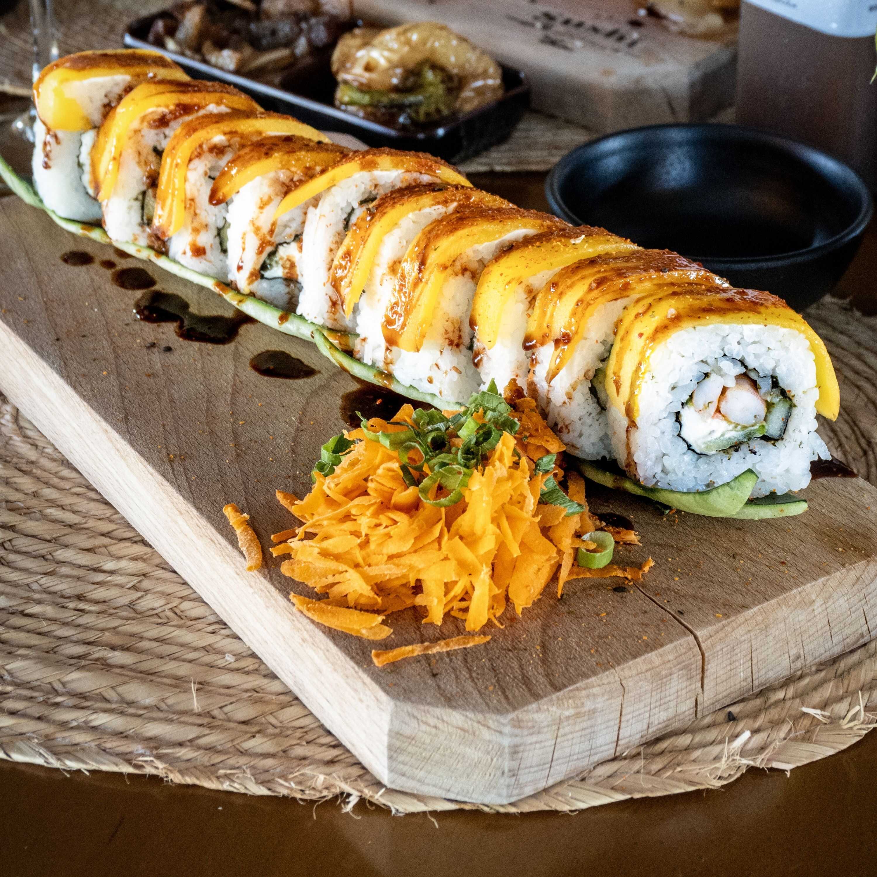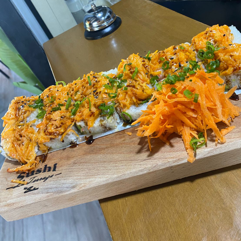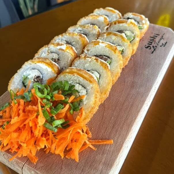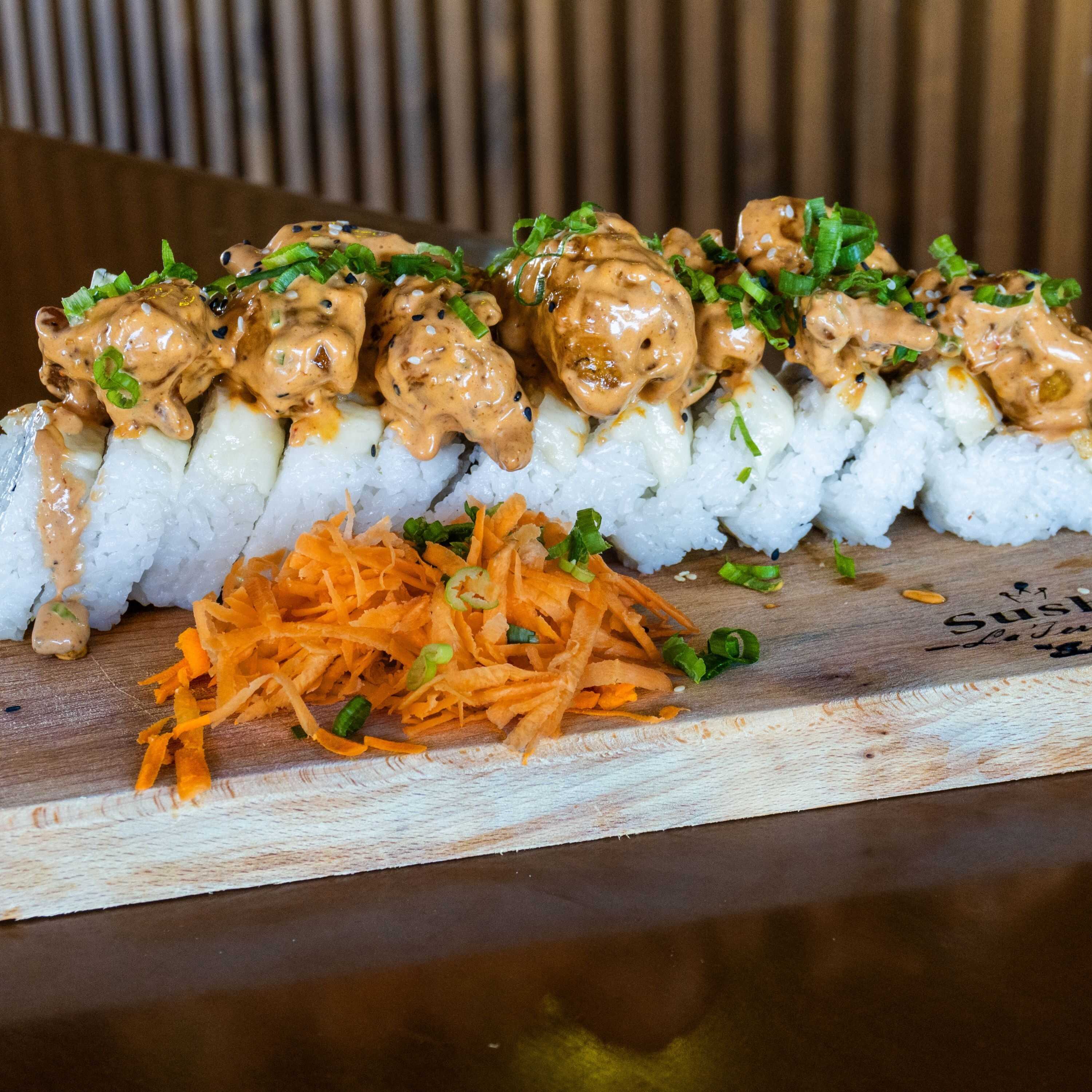 Por dentro: philadelphia, aguacate, pepino y camarón. Por encima: gratinado, kanikama spicy con trozos de camarón empanizados bañado en salsa de anguila y ajonjolí.