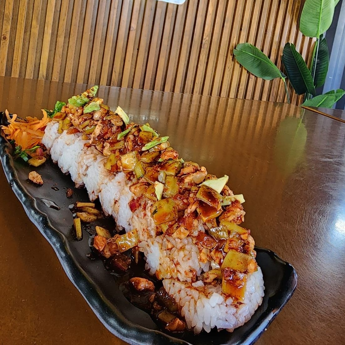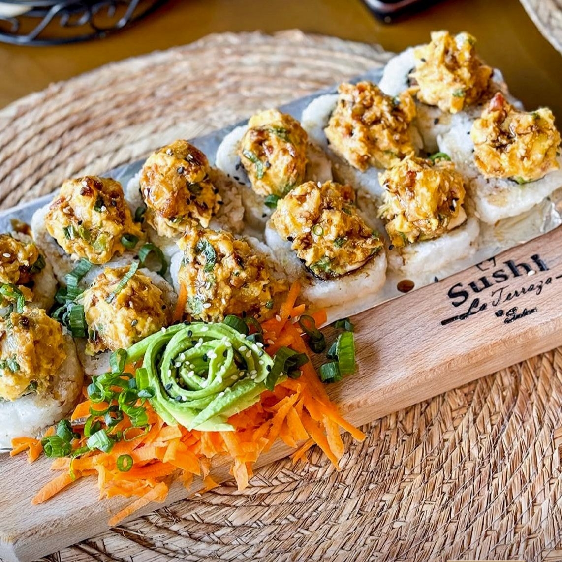 Por dentro: pasta craft y por fuera forrado de aguacate y por encima pasta de camarón con toque de sirracha bañada en salsa de anguila y ajonjoli