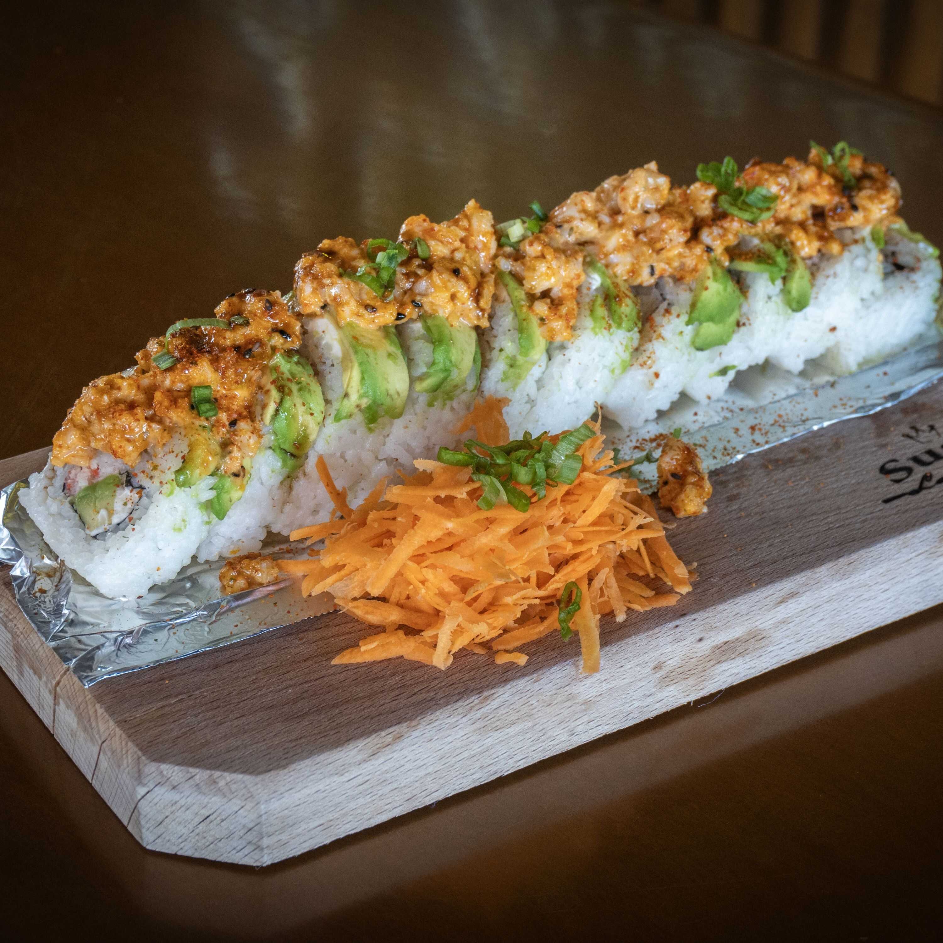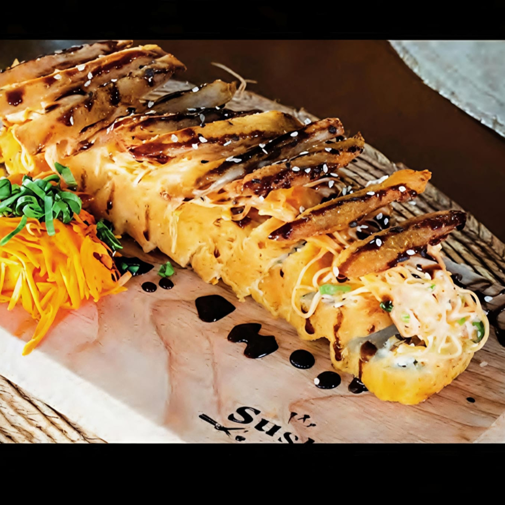 Por dentro: Philadelphia y pasta craft y por fuera forrado de aguacate y por encima kanikama spicy con trozos de camarón empanizados bañados en salsa de anguila