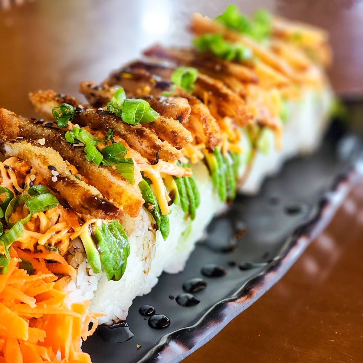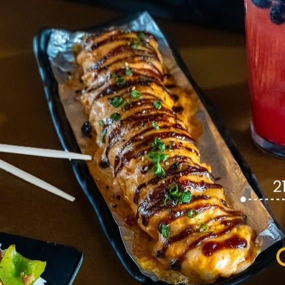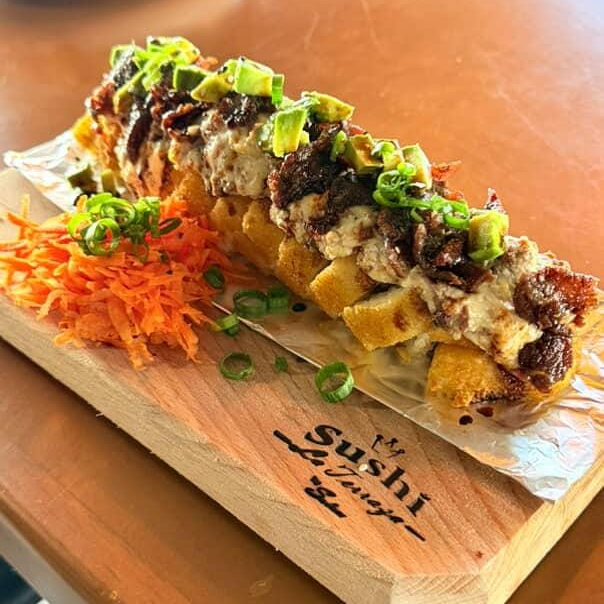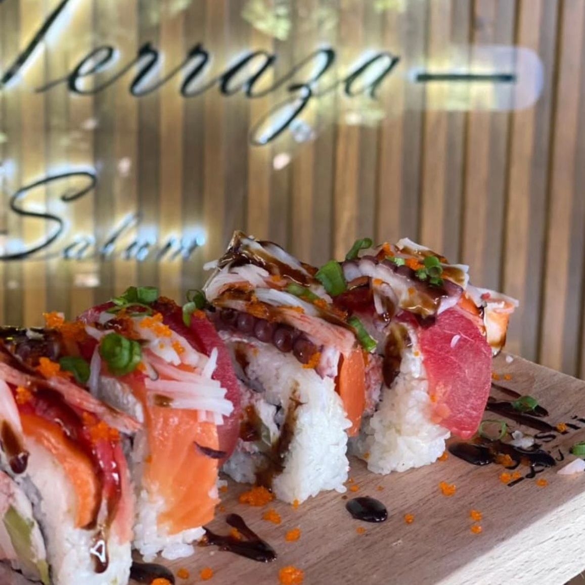 Por dentro: Philadelphia, aguacate,arrachera y tocino y por encima gratinado, acompañado de trozos de arrachera,tocino y serrano finamente picado con aderezo, bañado en salsa anguila