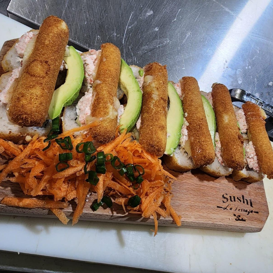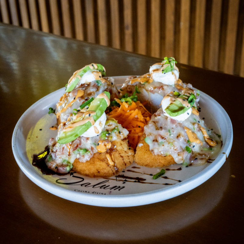 Por dentro: Philadelphia,aguacate,res,pollo, y tocino y por encima topping de tampico coronado con dedos de queso y laminas de aguacate