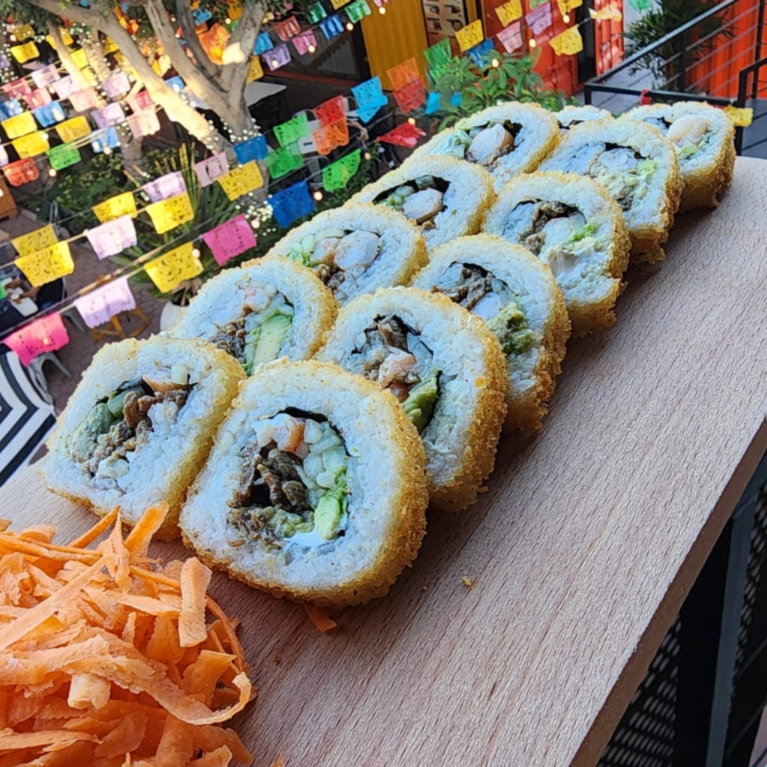 Por dentro: Philadelphia, aguacate, camarón y res y por fuera queso amarillo, y queso chihuahua