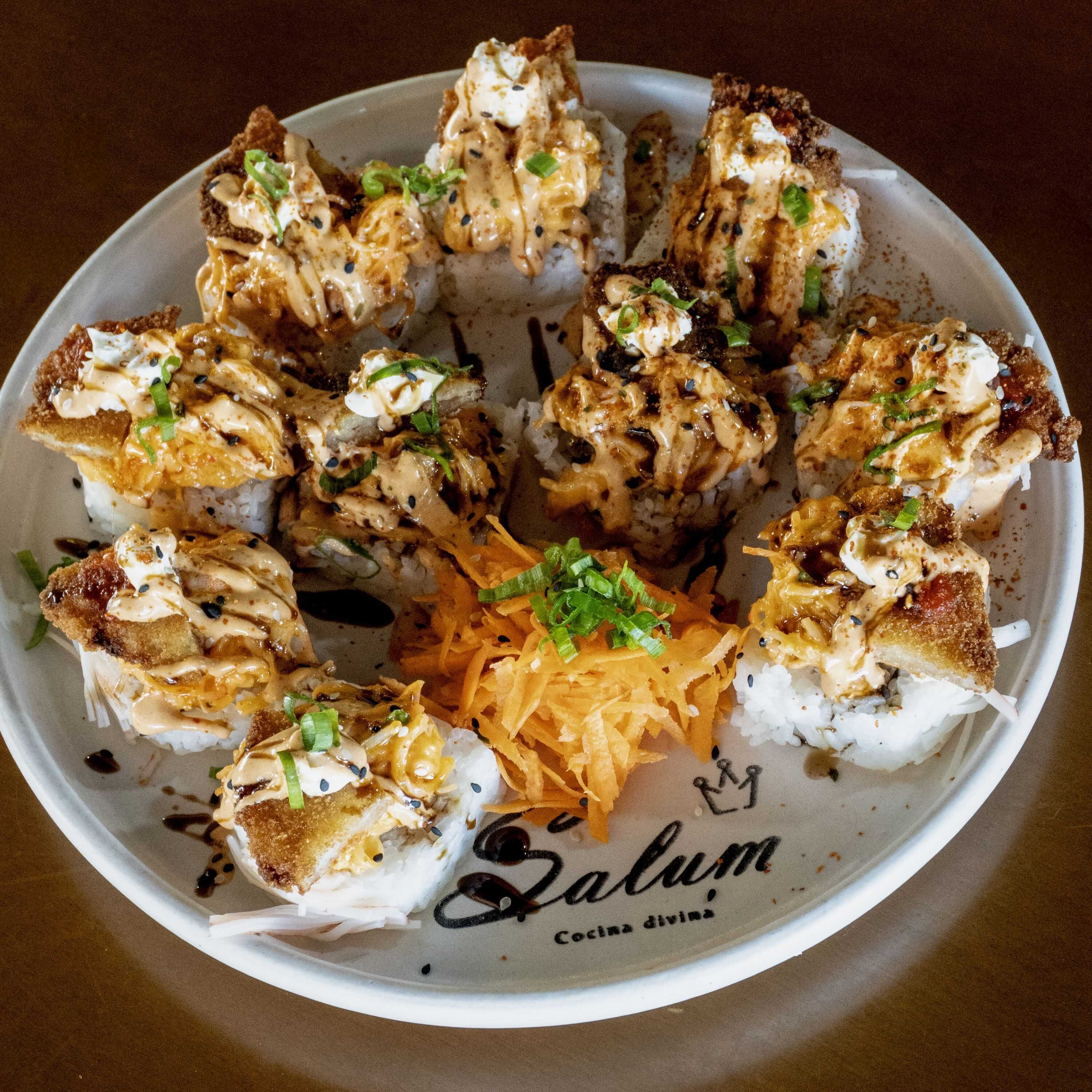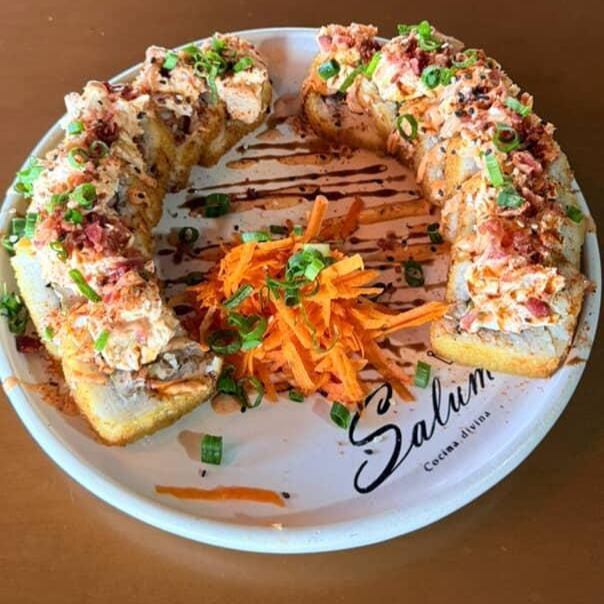 Por dentro: Philadelphia y pasta craft y por fuera forrado de aguacate y por encima kanikama spicy con trozos de camarón empanizados bañados en salsa anguila acompañado con una porción de aguachile bañado en salsa salum