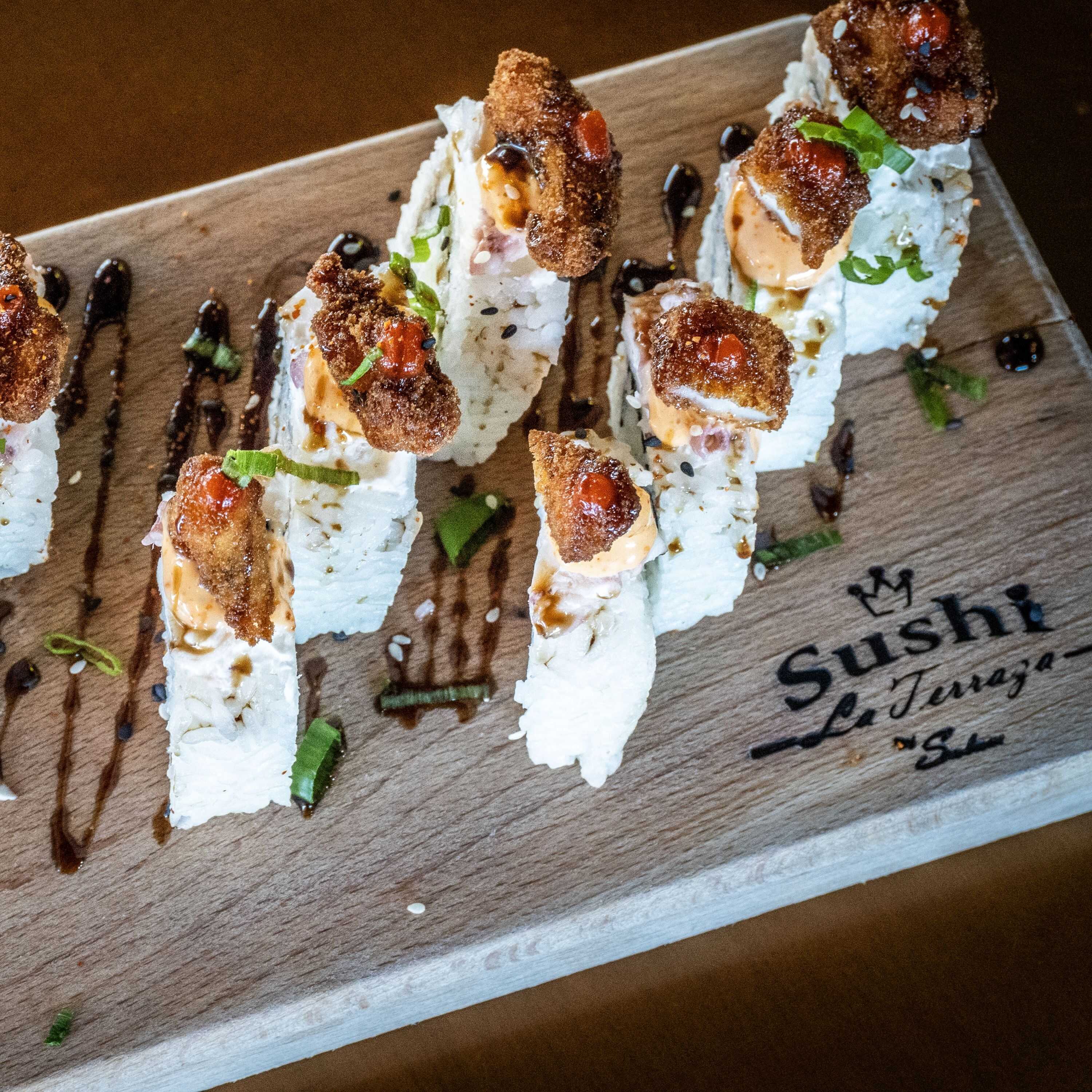 Por dentro: Philadelphia, aguacate, camarón y res y por encima coronado con tampico y queso chihuahua, salsa anguila y un toque de salsa sirracha