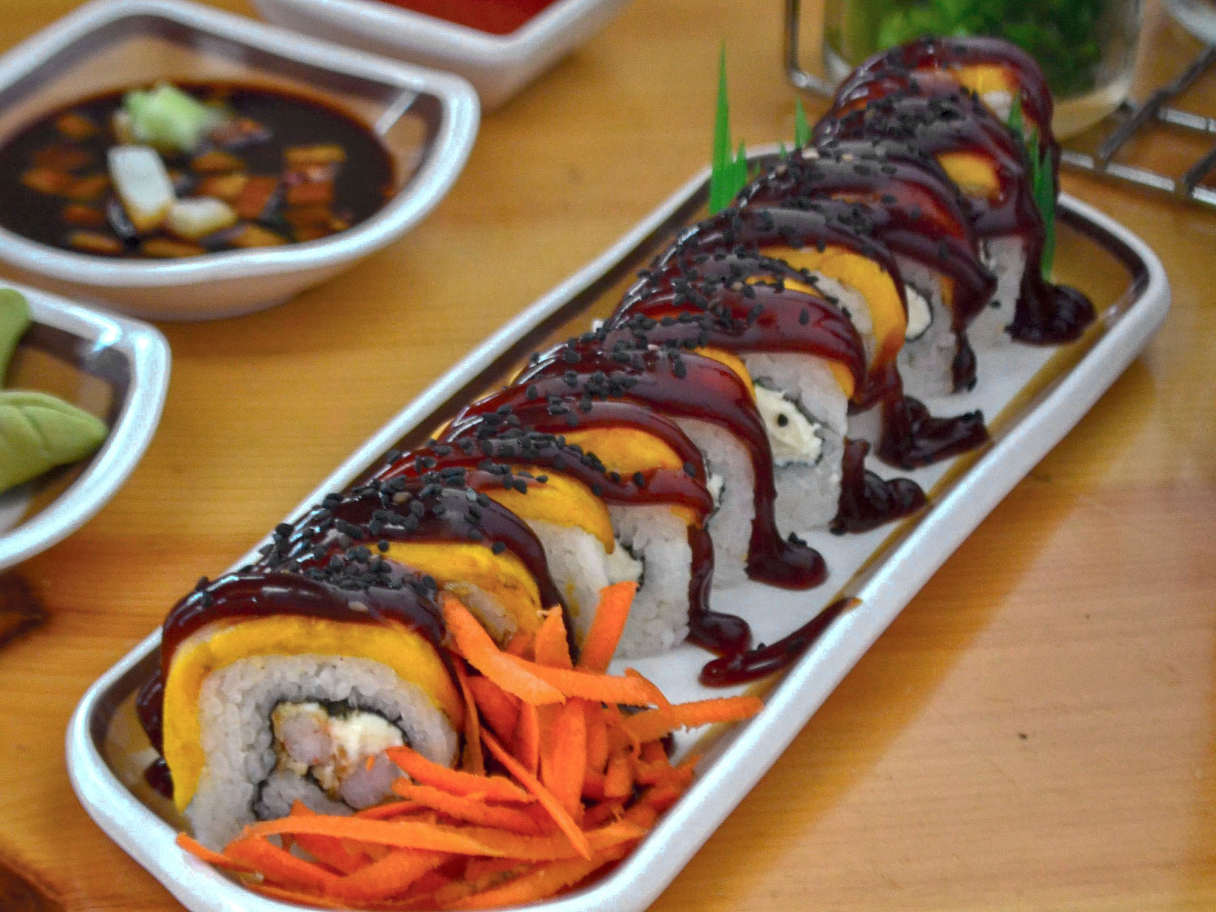 Arroz frito y arroz blanco, con res, pollo, camarón, philadelphia, cangrejo, surimi, cubierto de salsa de anguila, aguacate y ajonjolí.