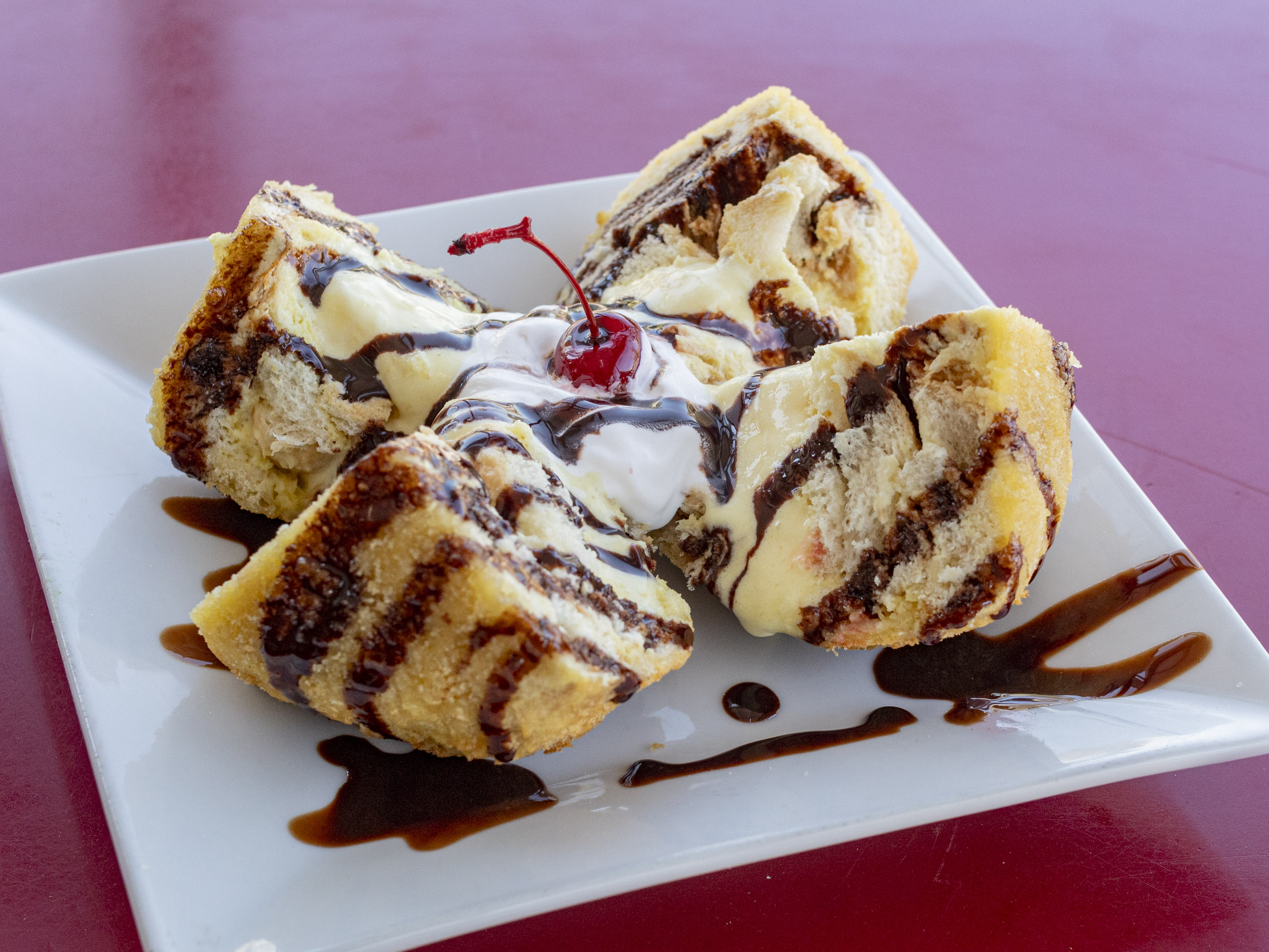 Deliciosa nieve de vainilla frita en tempura coronada con chocolate hersheys crema chantilli y cherry