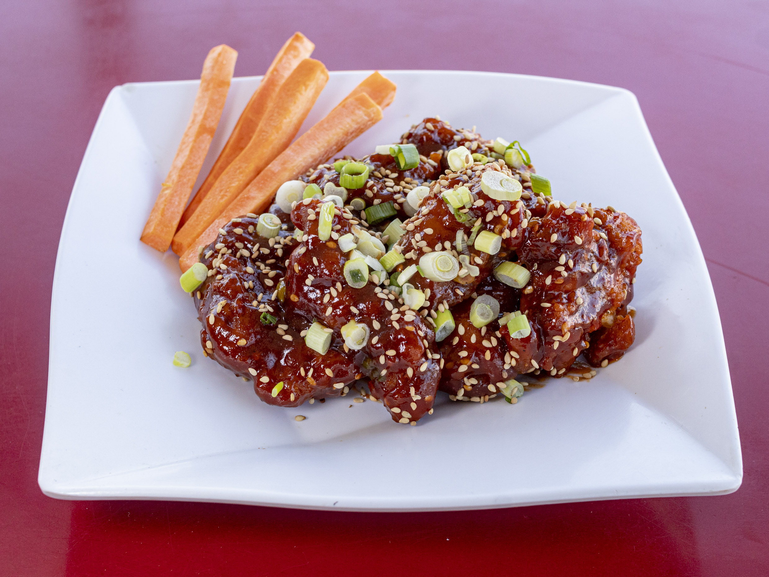Teriyaki de pollo servido con medio rollo California empanizado, arroz blanco y vegetales.