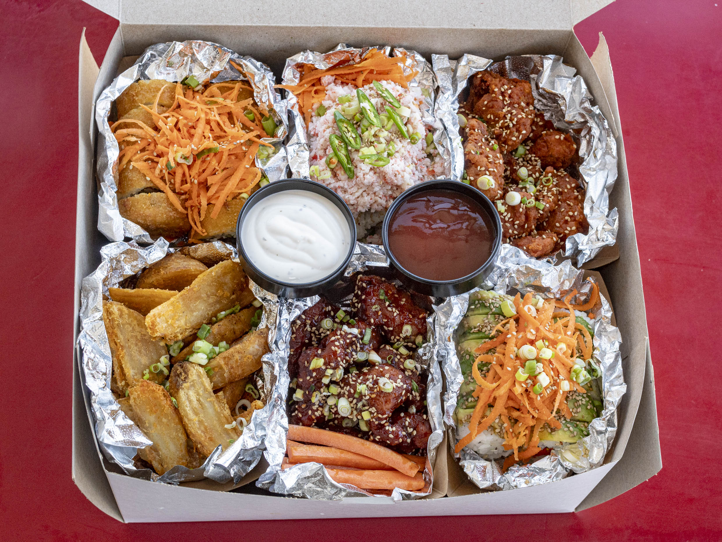 Combo de sushi y snacks que incluye 1 rollo spicy, 1 rollo mar y tierra, 1 rollo green-go, 350grs de alitas buffalo, 300grs de alita boneless y 300grs de papas gajo sazonadas.