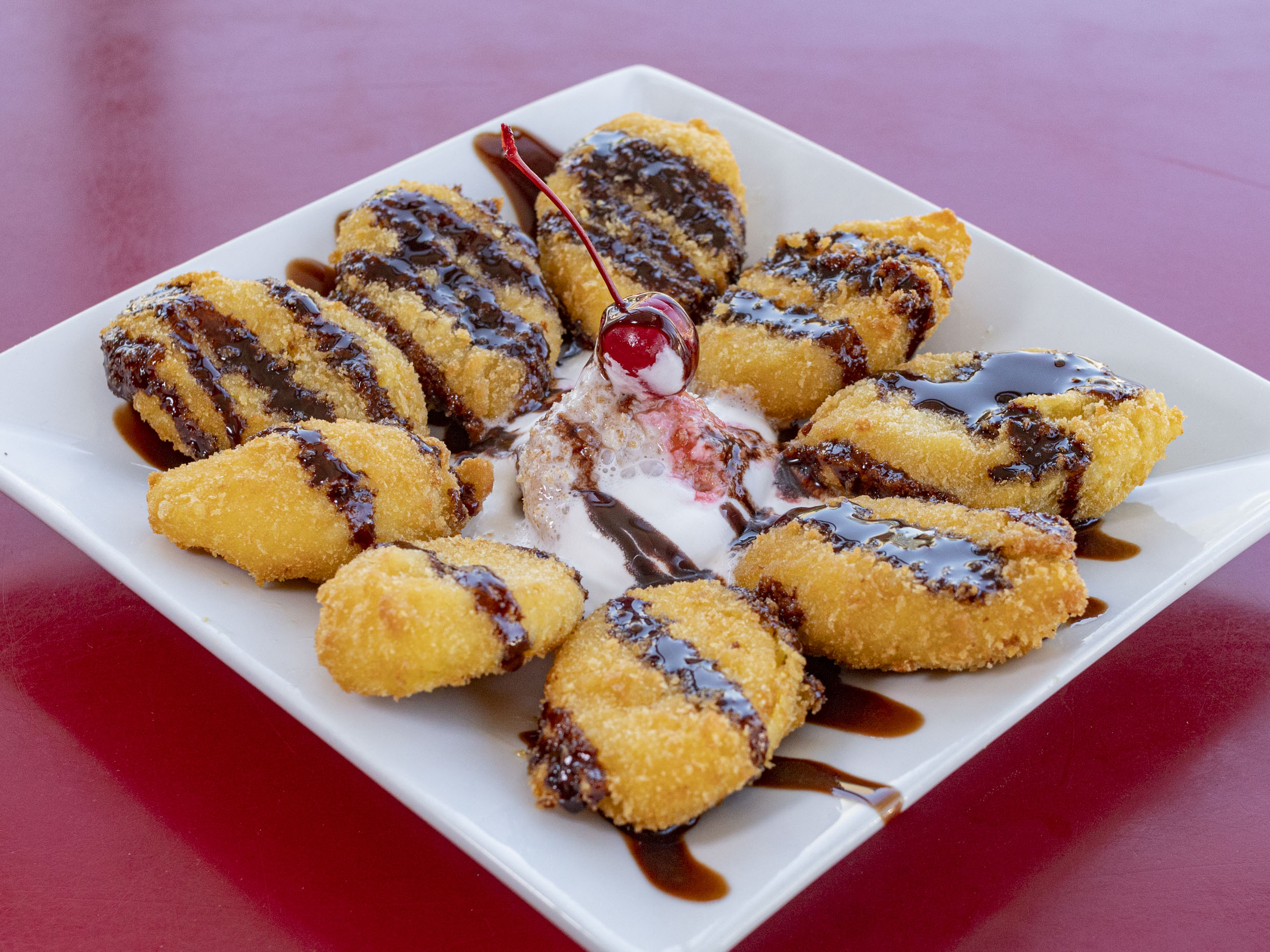 Platanitos fritos en tempura con nieve de vainilla coronados con chocolate hersheys chantilli y cherry