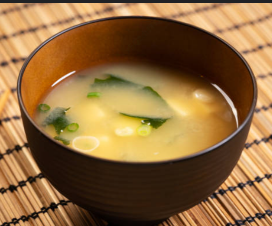 Sopa Miso acompañada de alga wakame, tofu, champiñones, cebollín y ajonjolí.
