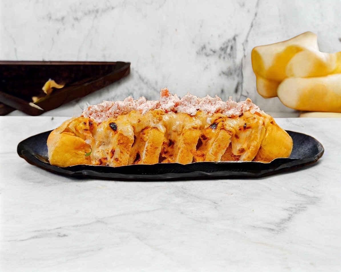 Philadelphia, aguacate, res y camarón por dentro, con un gratinado de queso Monterrey, queso americano y Philadelphia.
