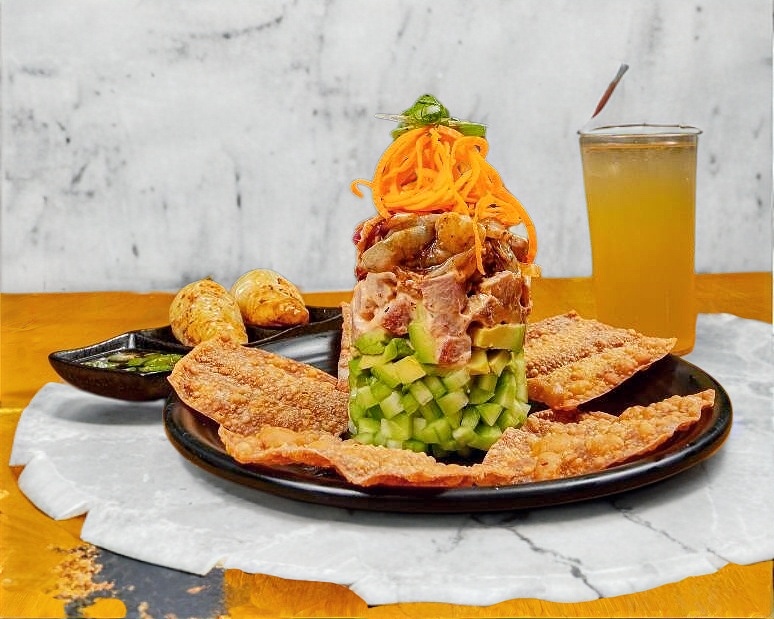 Philadelphia, aguacate, tocino, res y pollo por dentro, con tampico encima, camarones empanizados y la salsa de la casa.