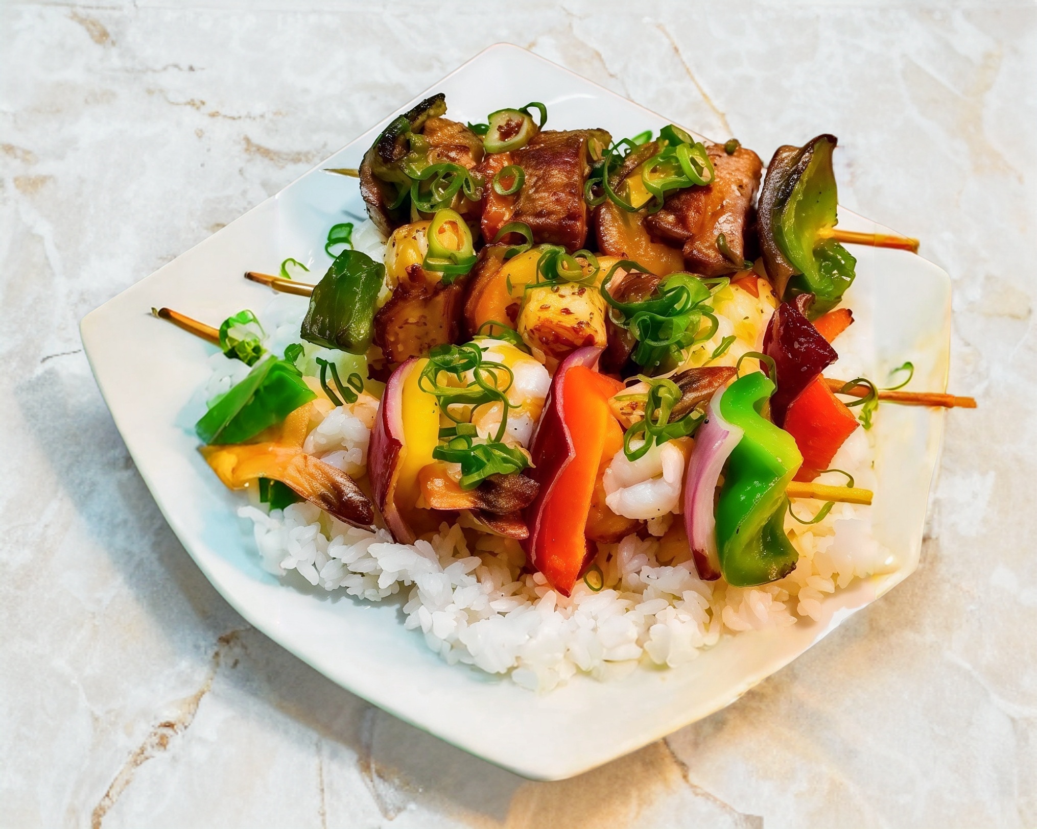 3 Brochetas de camarón, res y pollo con chile morrón más cebolla morada, sobre una cama de arroz.