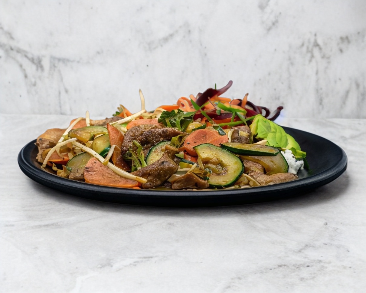 Pimiento verde, champiñones, calabaza, zanahoria y cebolla blanca, salteados con tu proteína favorita, servido sobre una cama de fideos udon.